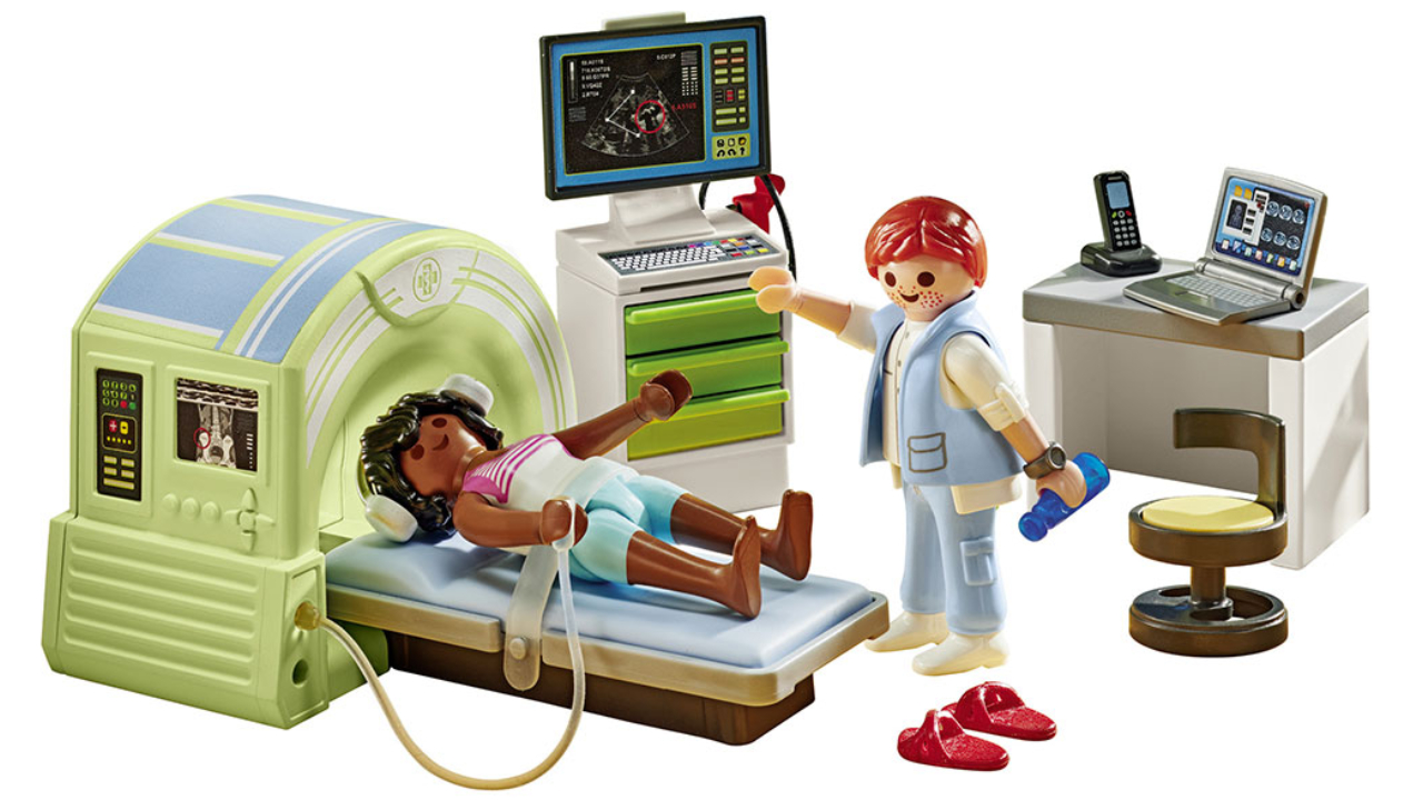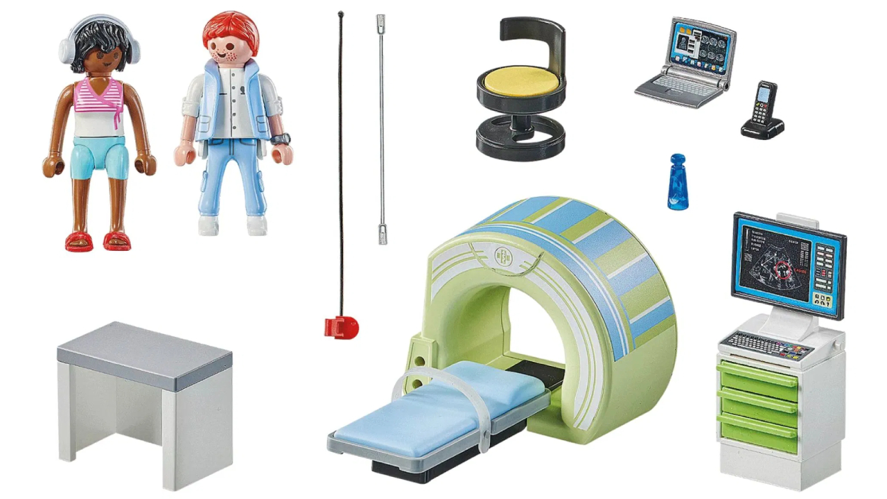 The 29-piece figure set includes everything kids need to recreate a visit to the radiologist: an MRI machine with mobile bed, an ultrasound machine, desk and laptop, as well as two PLAYMOBIL figures and other great medical accessories.