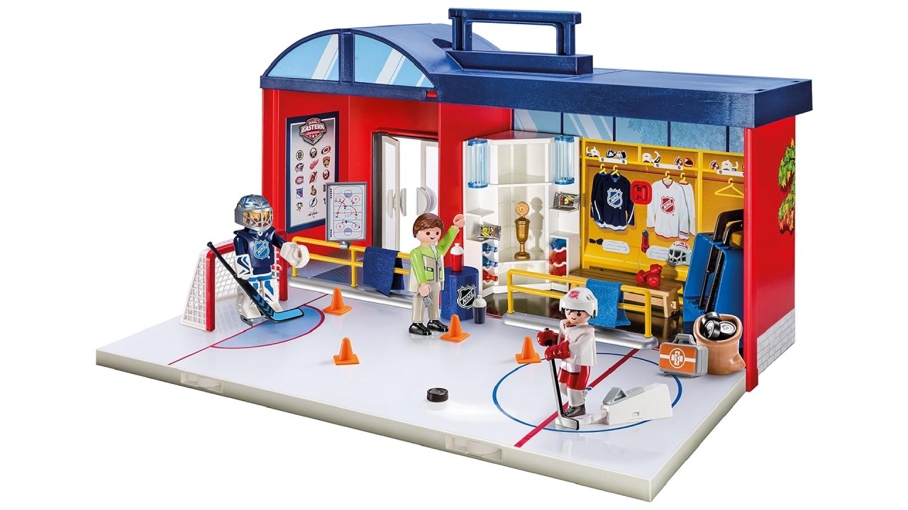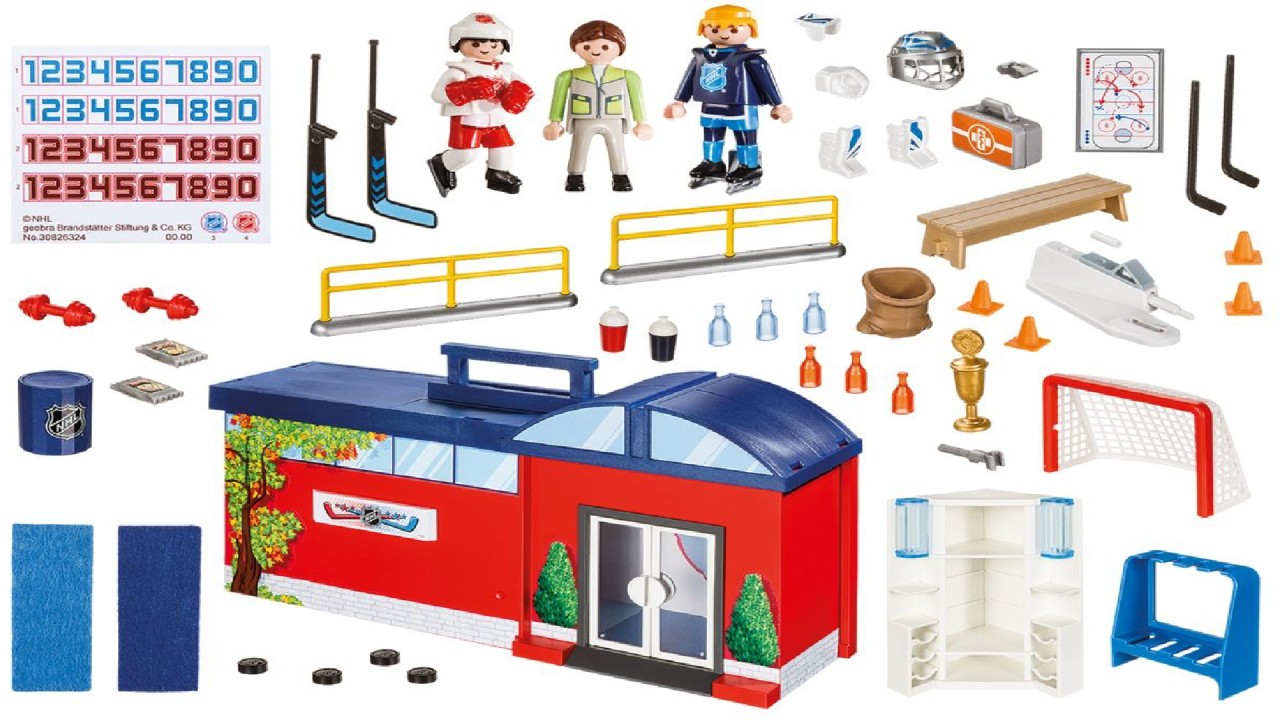 Setul include trei figurine, structura arenei, o plasă de poartă, o bancă laterală, balustrade, trusă de prim ajutor, strategii de joc, numere pentru tricouri, bastoane de hochei, pucuri, gantere și multe alte accesorii de hochei.