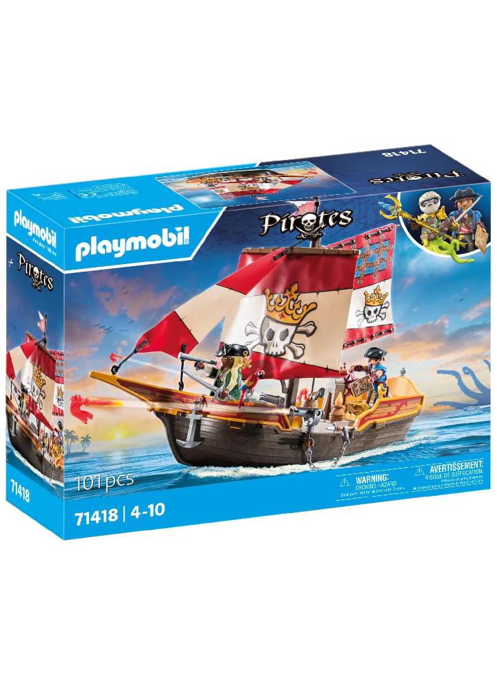 Setul detaliat include o corabie de pirați cu vele mobile, tunuri rotative, două figurine PLAYMOBIL, un papagal și o ancoră și multe alte detalii și accesorii interesante.