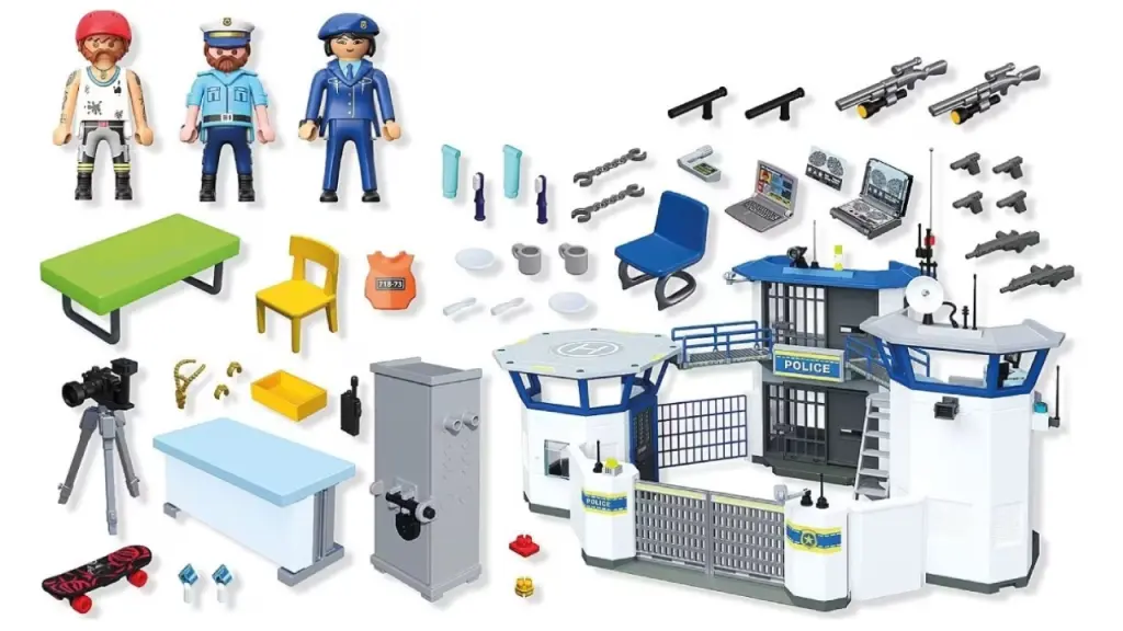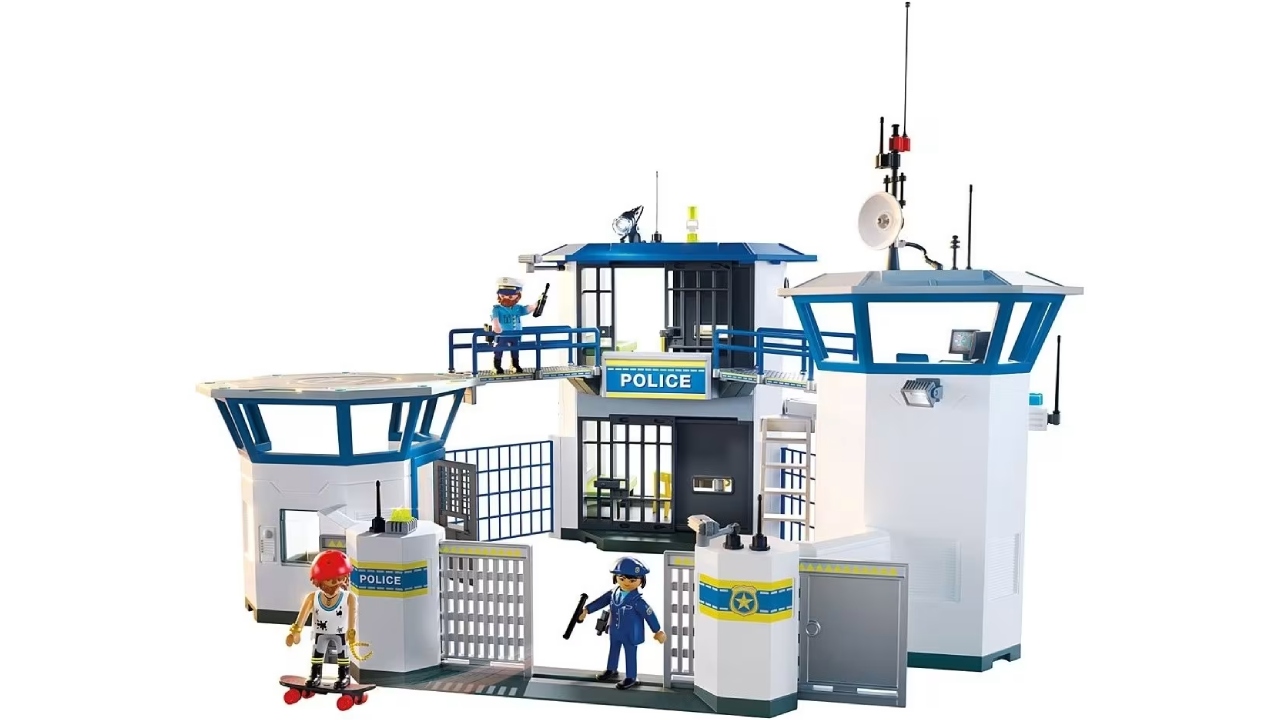 The chase begins at the Police Command Center! Criminals beware - officers are equipped with fingerprint scanners (transparencies included), a lockable gun cabinet and even convict uniforms to outfit suspects.