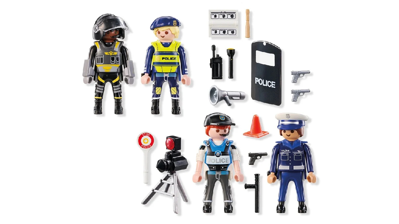 With four police officers and a range of realistic accessories, such as heels, a megaphone and a police shield, the imaginative game possibilities are unlimited.