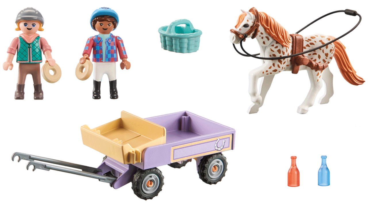 Bucură-te de o distracție unică alături de căruciorul cu ponei PLAYMOBIL! Acesta vine cu două figurine și un ponei, dar și cu o mulțime de accesorii interesante.