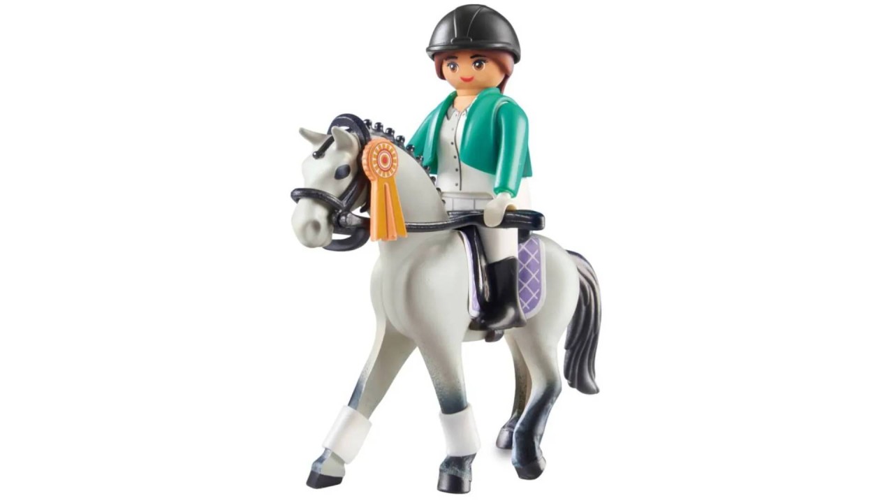 Includes a Playmobil figure, horse and adorable accessories. The rider is getting ready for the big horse show!