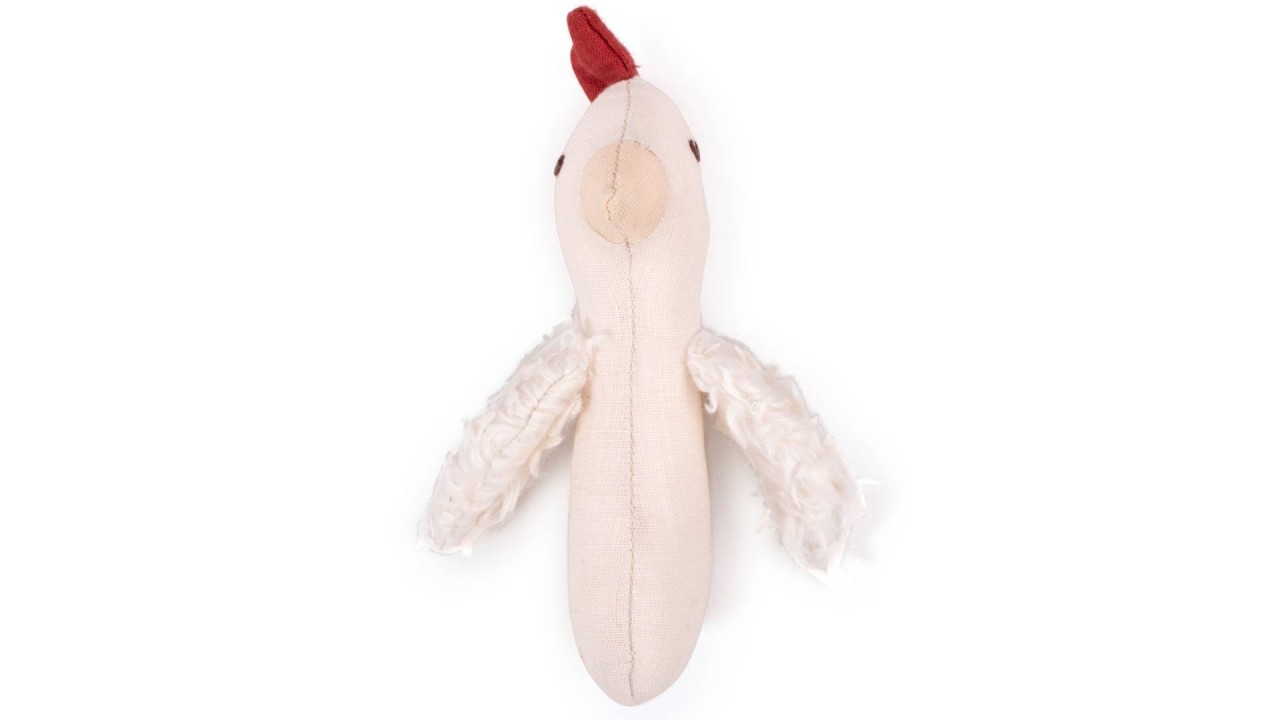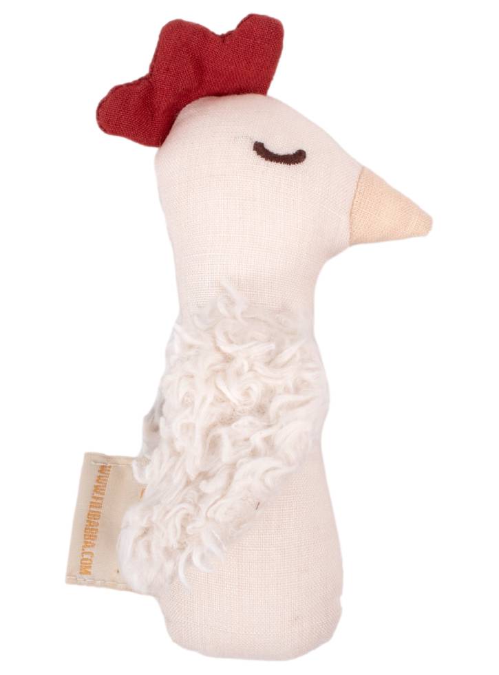 Acest zornăitor drăguț cu un cap de găină drăguț este confecționat din țesătură moale de in.