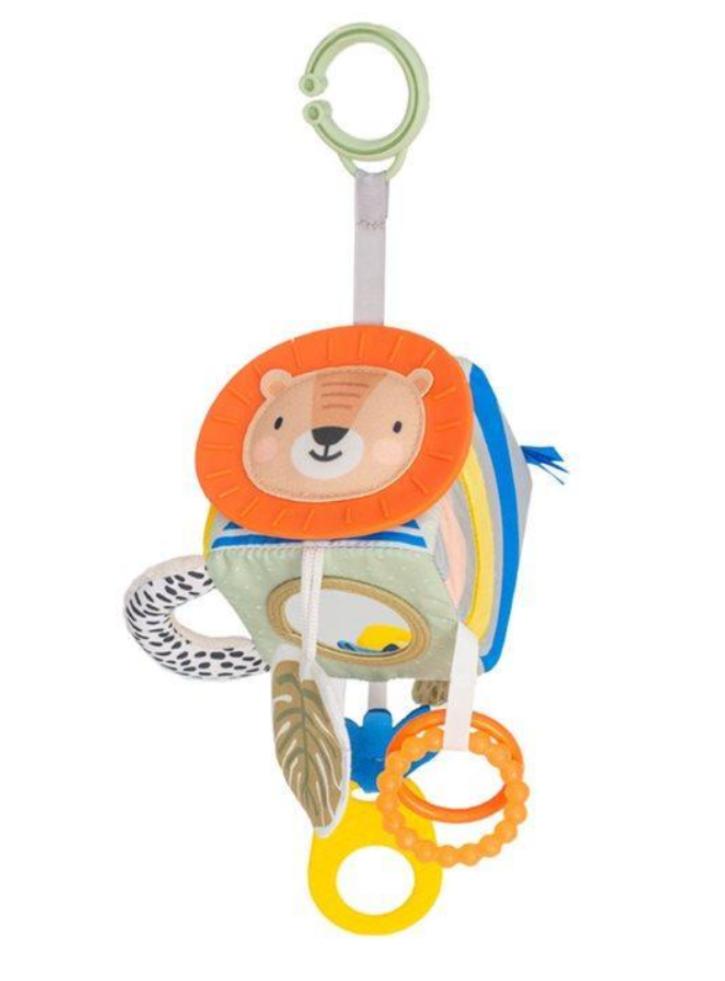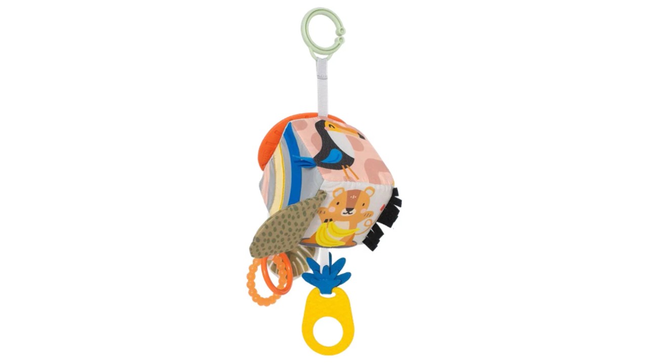 Prezintă dințișori, o oglindă sigură pentru bebeluși, clape încrețite, inele care atârnă și o mulțime de oportunități de a ajunge și de a apuca.