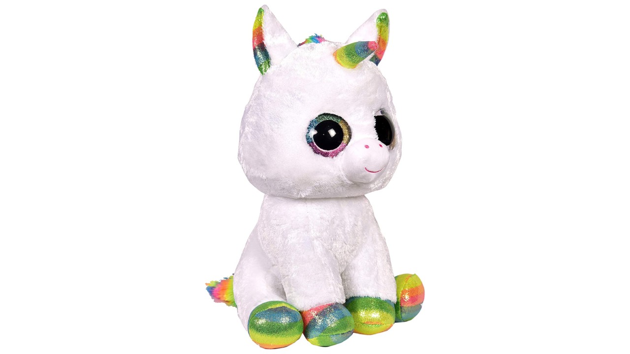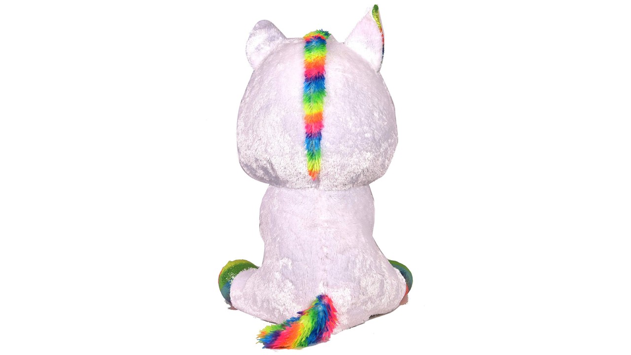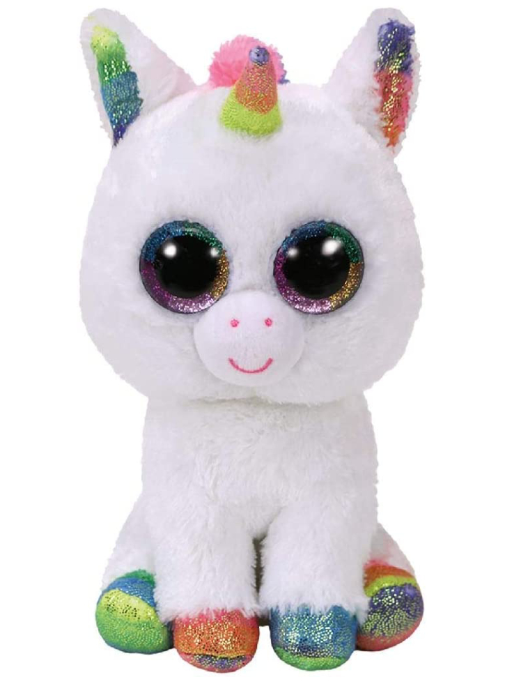 Faceți cunoștință cu pixy! Un unicorn alb, unicat, accesorizat cu accente de sclipici curcubeu texturat Regina magică a unicornilor, este confecționată din țesătură moale de mătase Ty.