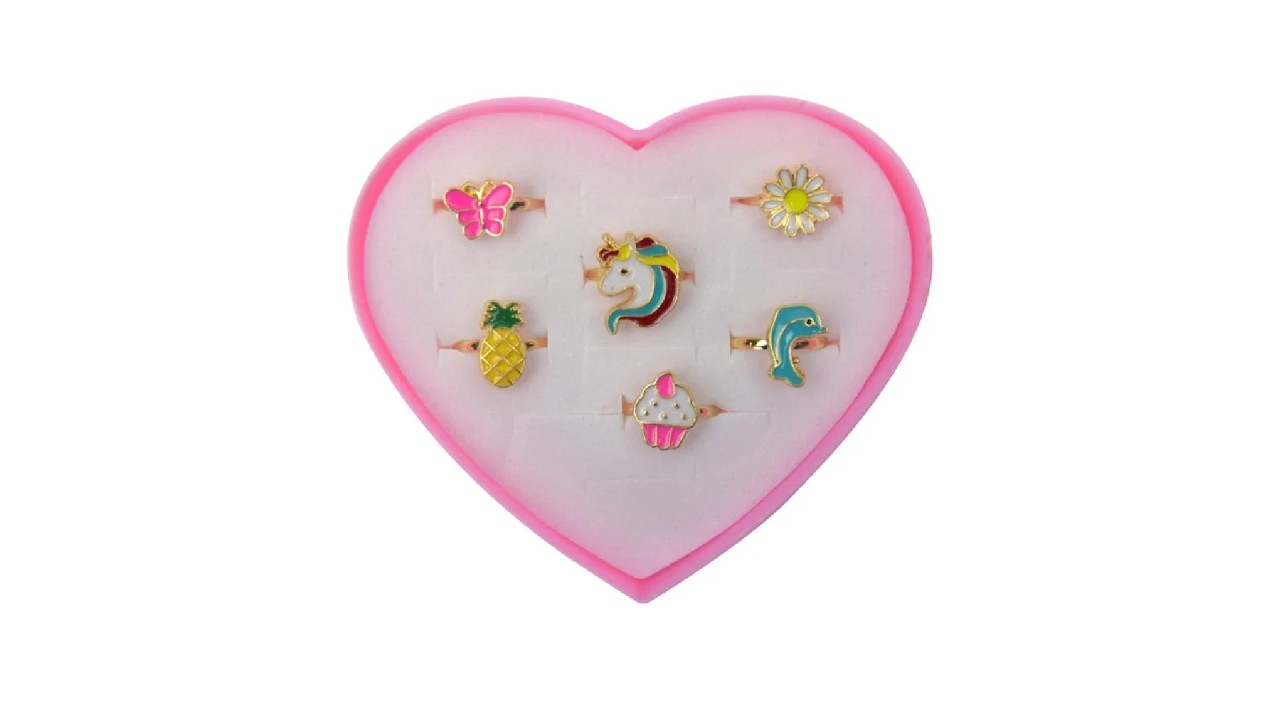 Setul include 6 inele adorabile, fiecare cu un design diferit: fluture, unicorn, ananas, floare, delfin și prăjitură. Vei avea mereu posibilitatea de a alege ce inel să porți în fiecare zi.