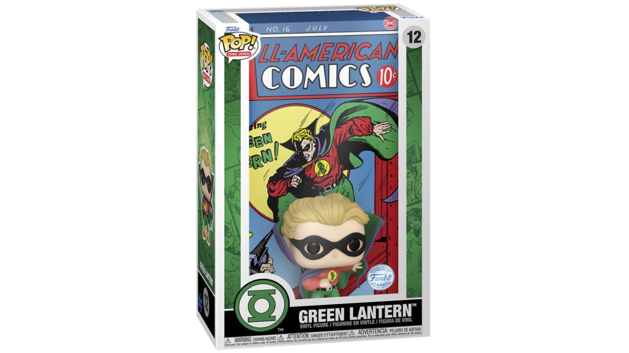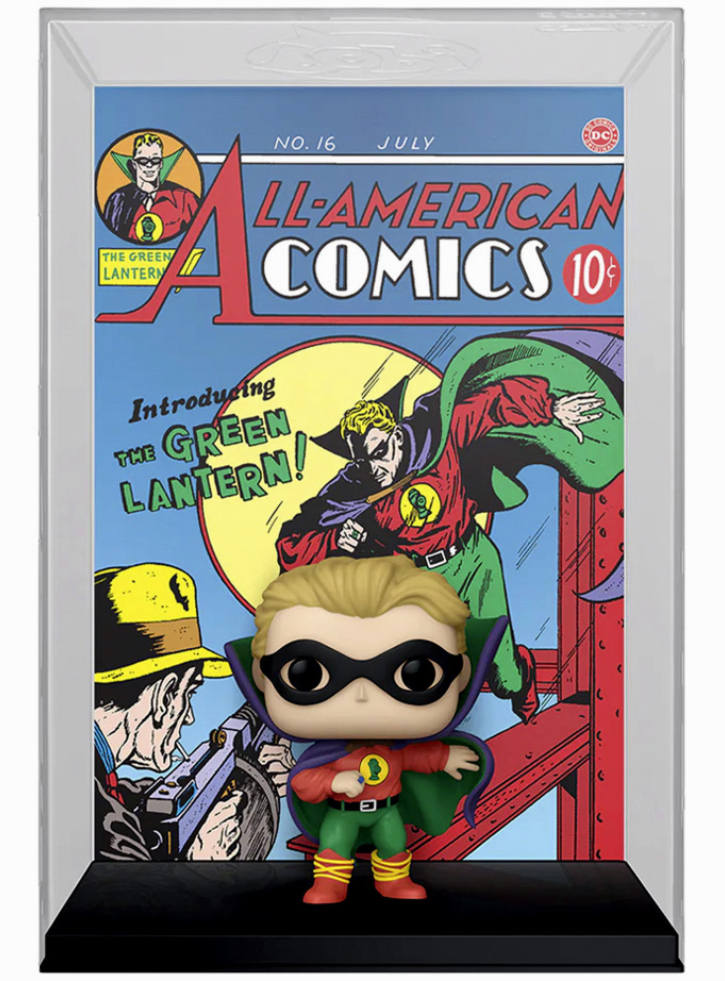 Afișat în fața copertei iconice a revistei All-American Comics nr. 16, Green Lantern apare în costumul său clasic de supererou.
