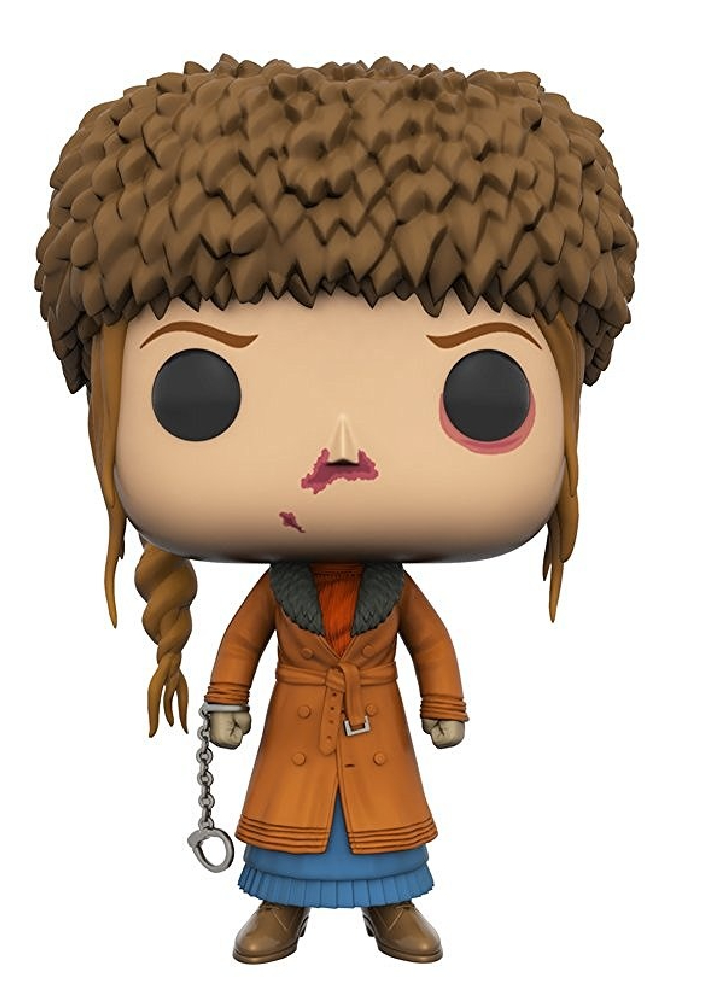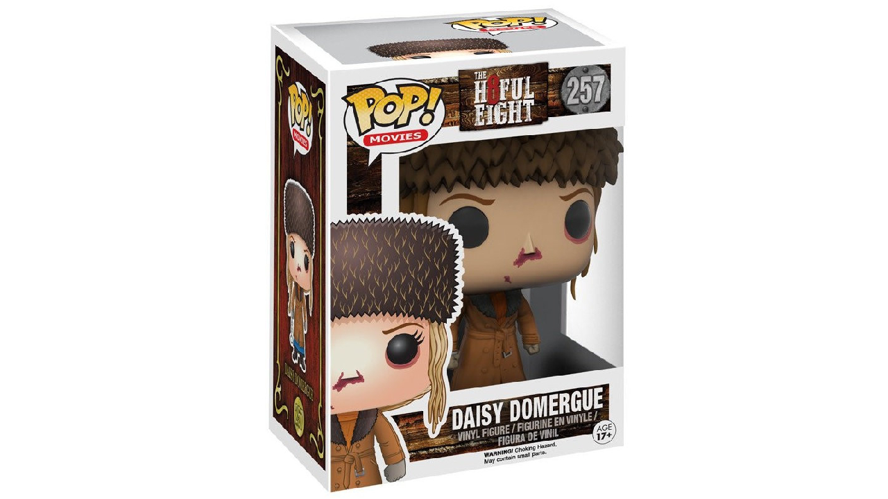 Vor supraviețui? Această figurina de colecție Hateful Eight Daisy Domergue Pop! prezintă personajul lui Jennifer Jason Leigh cu o pereche de cătușe la încheietura mâinii drepte.