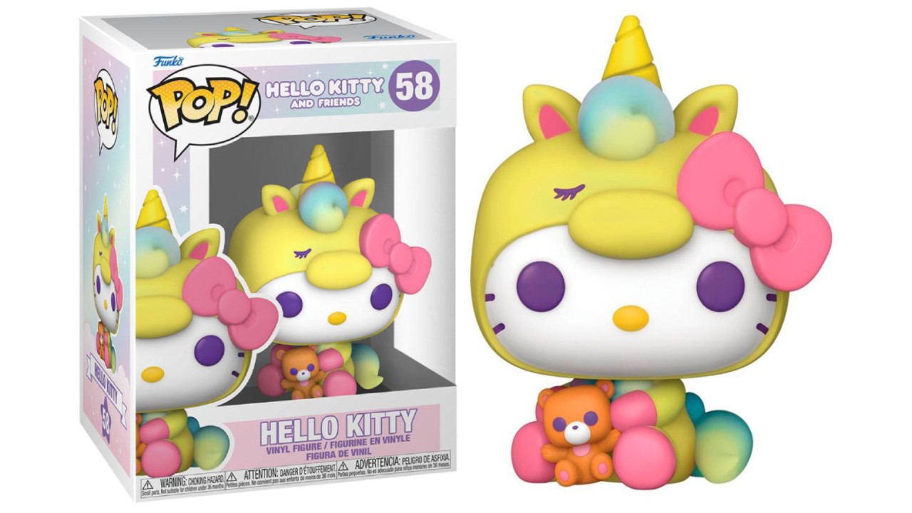 Ești invitat la petrecerea în pijamale a viselor tale! Ai ocazia să întâlnești Pop! Hello Kitty Unicorn Party, care poartă o pijama colorată de unicorn și ține în brațe un ursuleț de pluș.