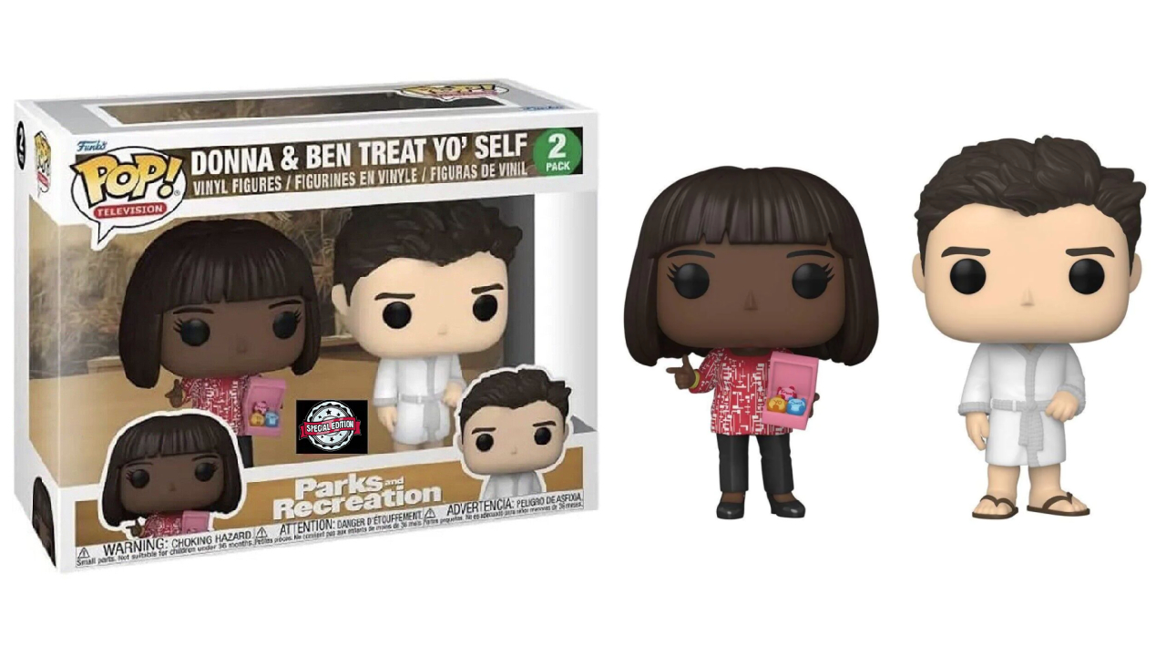 Pack of 2 with Donna holding the box of treat yo self donuts that Tom bought, as well as Ben wearing his day spa robe (much prefers the Batman suit).