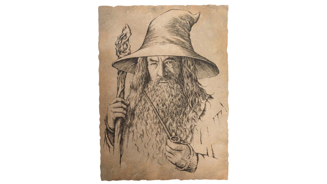 This painstakingly detailed engraving of Gandalf the Gray (similar to Ian McKellen, who played Gandalf in the films) comes from the pen of the inimitable artist and calligrapher Daniel Reeve of 3Foot7's art department.