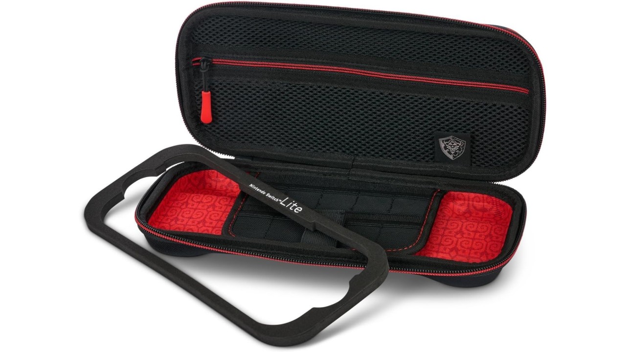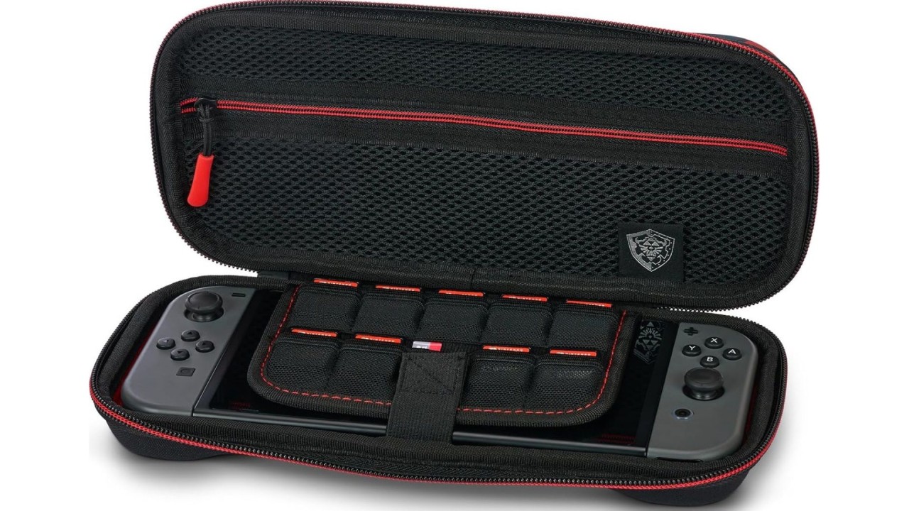 Capacul căptușit încorporat pentru protecția ecranului include spațiu de stocare pentru nouă carduri de joc.