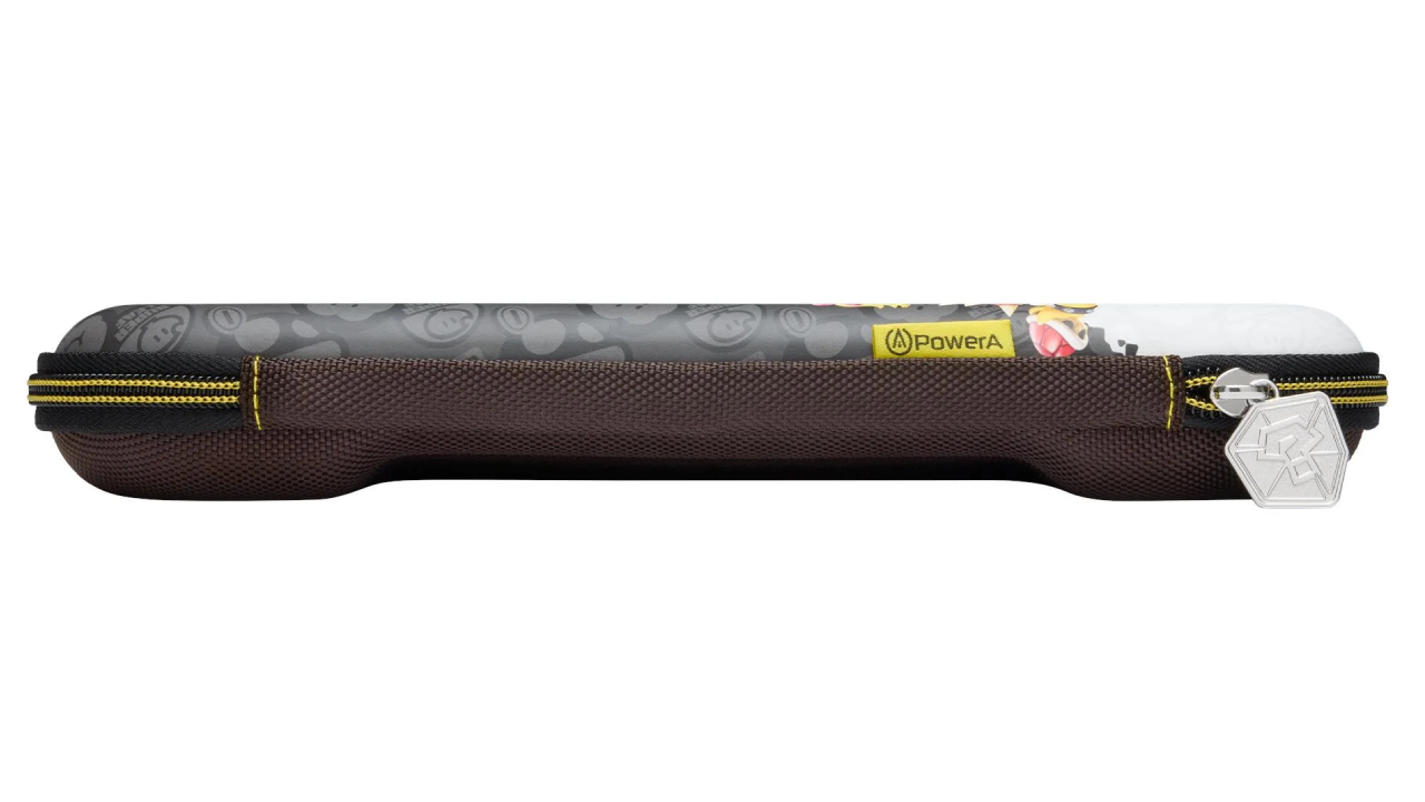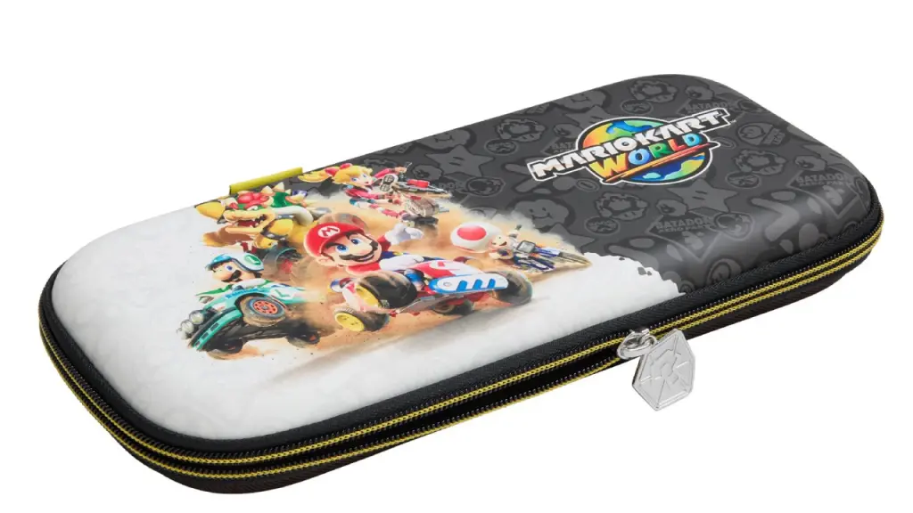 Cu ilustrații vibrante ale personajelor din Mario Kart World, această husă portabilă aduce entuziasmul pistei cu tine oriunde te joci.