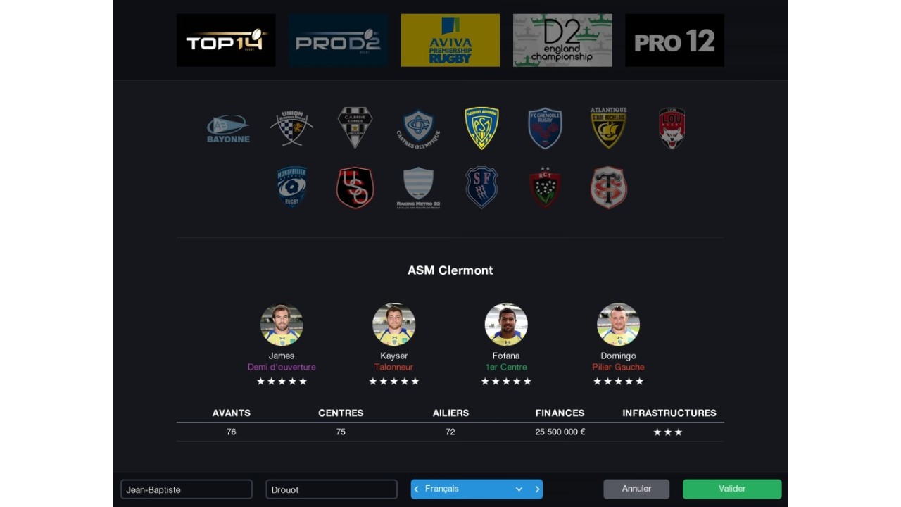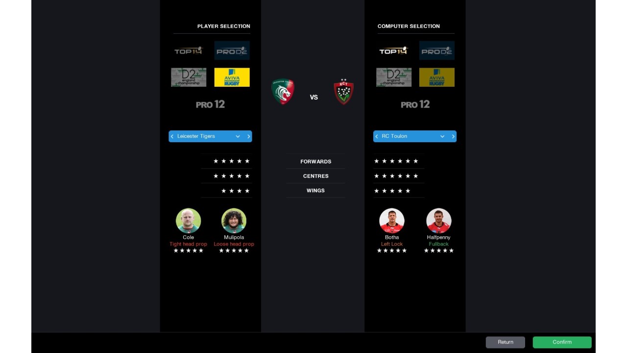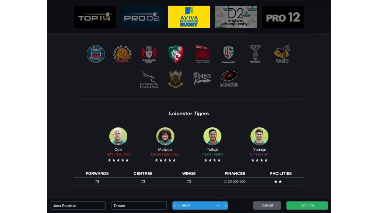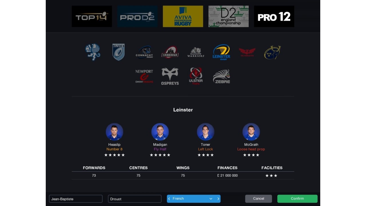 Developed under license from the biggest rugby union leagues in the world: Aviva Premiership Rugby, PRO12 and Ligue Nationale de Rugby, Pro Rugby Manager 2015 will give you the opportunity to manage any of the 54 official teams from these leagues.