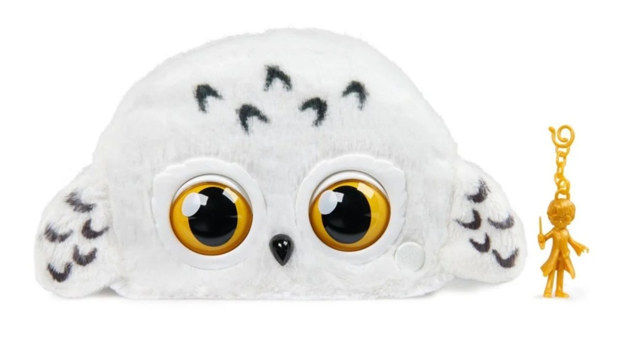 Descoperă țesătura și aripile moi de pluș ale lui Hedwig, ochii aurii expresivi, cureaua metalică reglabilă și farmecul Harry Potter auriu de la Magical Mini pentru a fi atașat la curea.