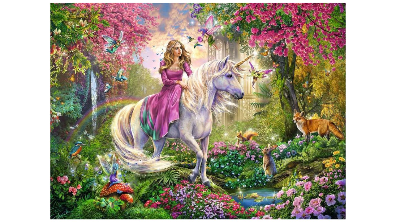 This wonderfully colorful scene is full of emotion and detail. A beautiful fairy tale princess is transported around her kingdom by her trusty unicorn.