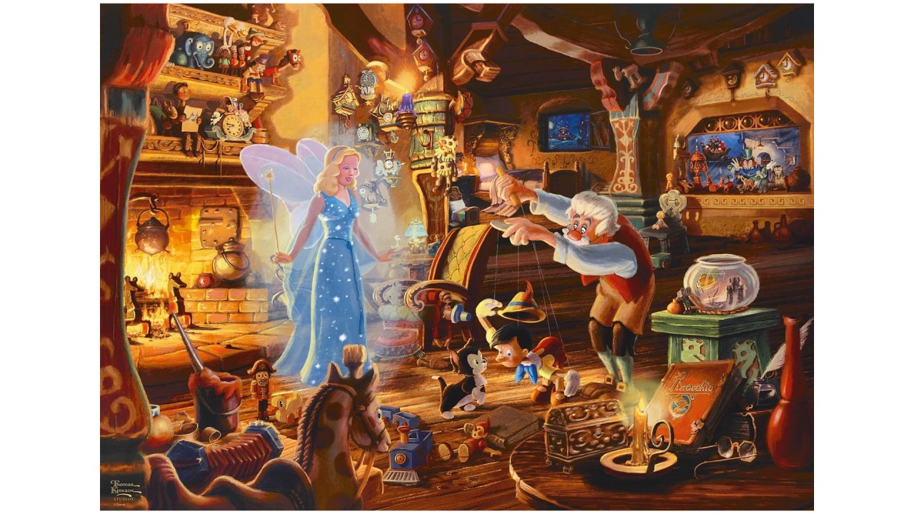 Acest puzzle de 1000 de piese este o ilustrare magică a filmului Disney Pinocchio de la studiourile Thomas Kinkade.