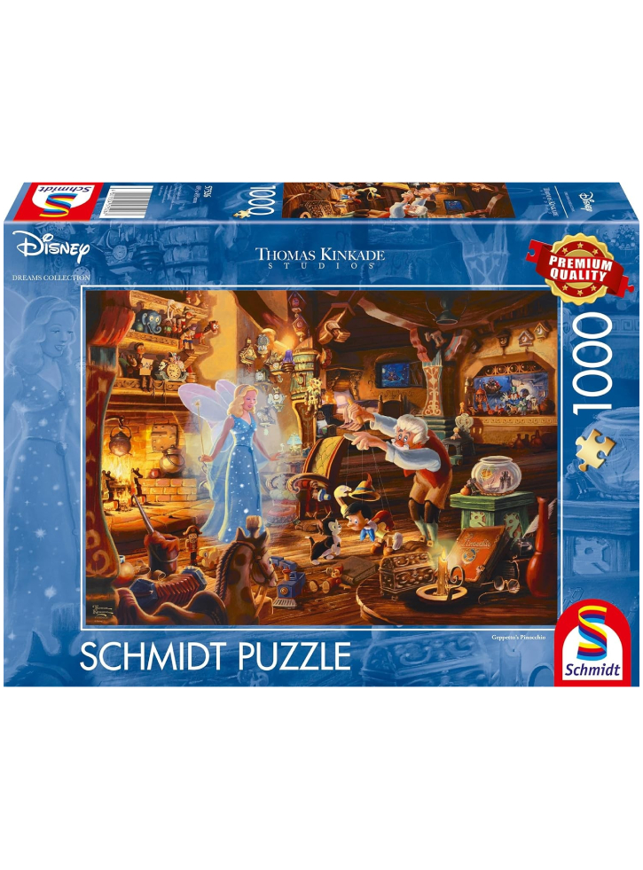 Geppetto's Pinocchio este un puzzle jigsaw de calitate premium de 1000 de piese din colecția Thomas Kinkade Disney Collection de Schmidt.