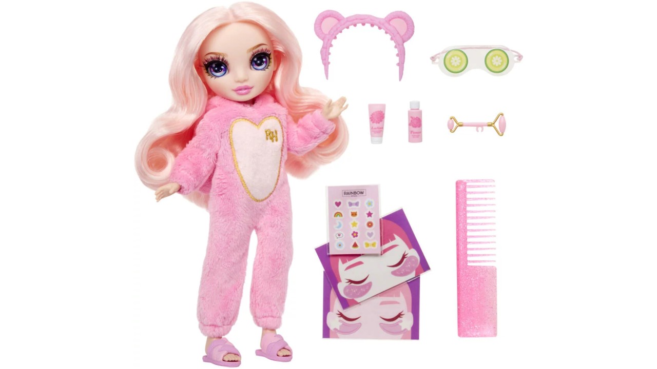 Fashion doll, a full pajama outfit, a pair of doll slippers, cucumber eye mask, bin stickers, face rollers, under eye masks, hair band and doll comb.