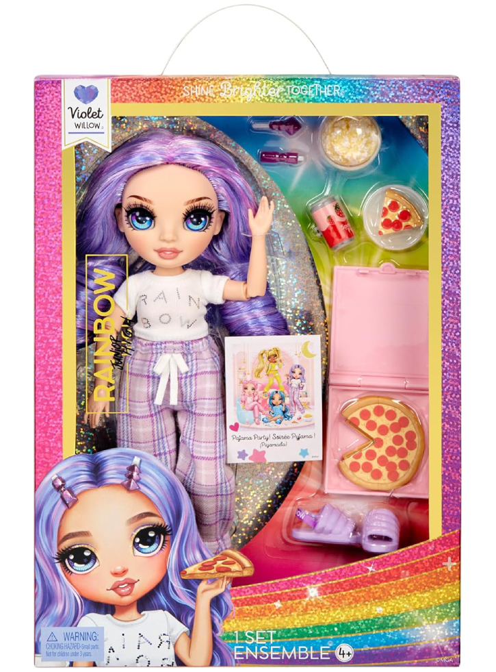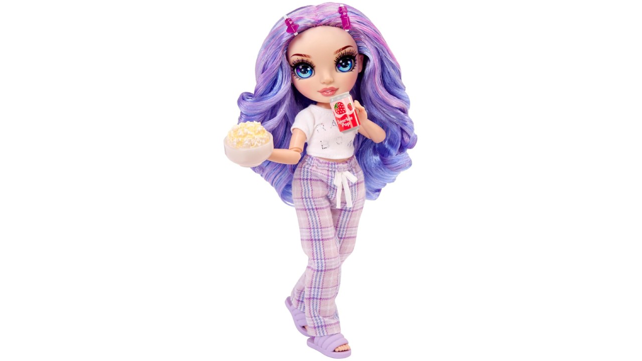 Violet este îmbrăcată într-un adorabil pantalon mov cu carouri, cu un tricou moale, papuci mov asortați.