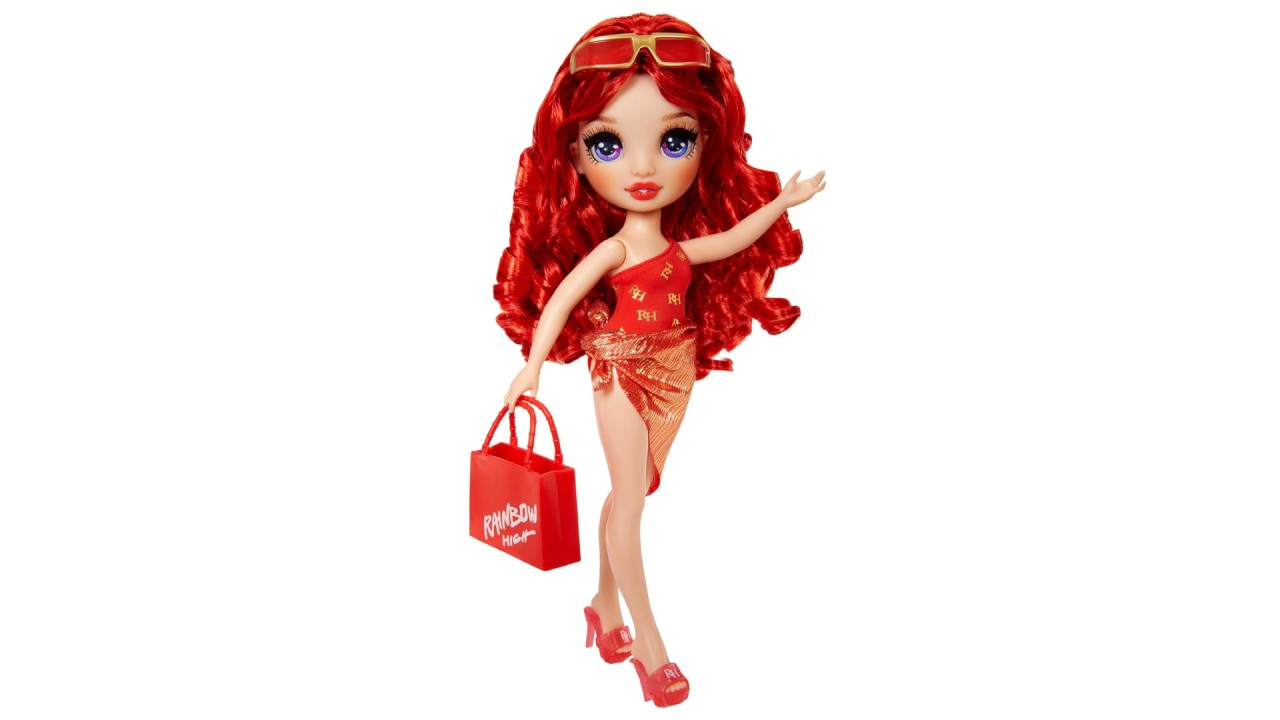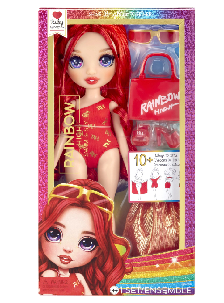 Ruby este pregătită pentru o zi de distracție cu prietenii în adorabilul ei costum de baie roșu cu un singur umăr, sandale roșii asortate, ochelari de soare și geantă de mână, minunate pentru piscină, pentru joaca în baie.