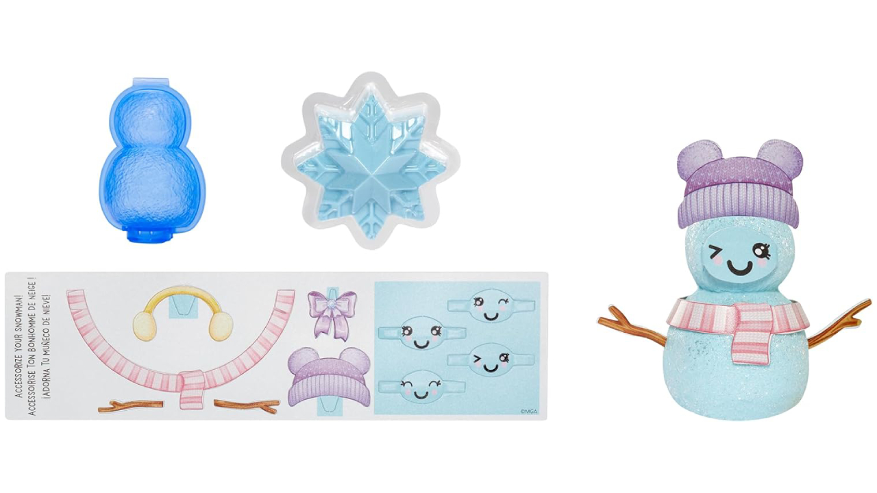Bonus, fiecare păpușă include, de asemenea, un kit pentru a vă face propriul om de zăpadă cu „zăpadă” modelabilă și accesorii distractive.