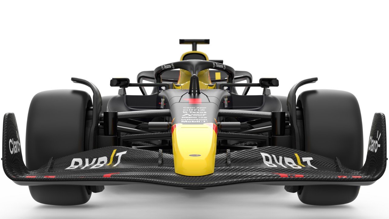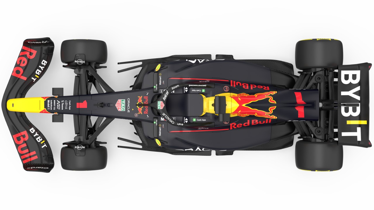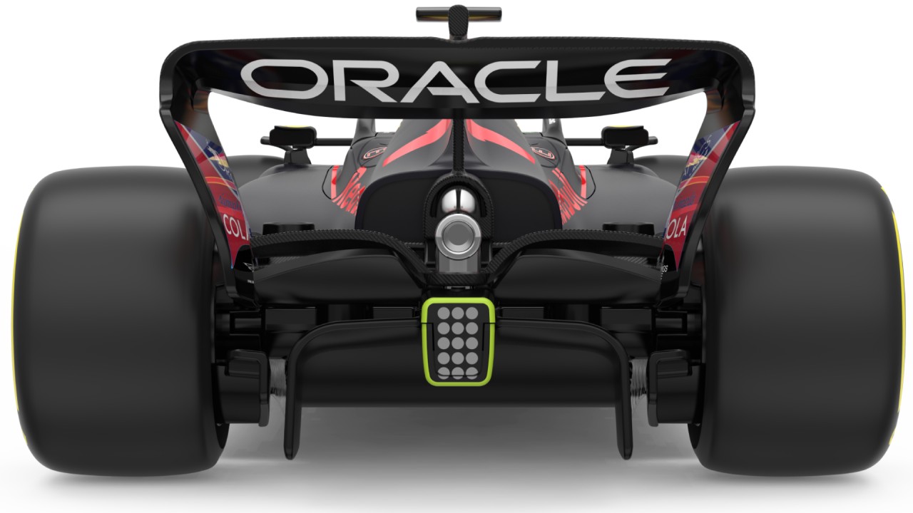 Mașina iese în evidență cu detalii deosebite, inclusiv un spoiler spate negru al caroseriei cu inserții albastre, logo-ul RB în partea din față și anvelope de marcă Pirelli.