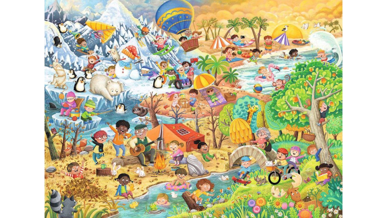 This delightful puzzle features four vibrant scenes, each representing a different season - spring, summer, autumn and winter.
