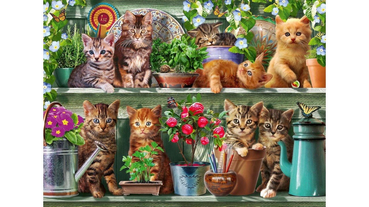Această scenă colorată și detaliată înfățișează 8 pisicuțe drăguțe cocoțate printre plantele, ghivecele și florile unei magazii cu ghivece.