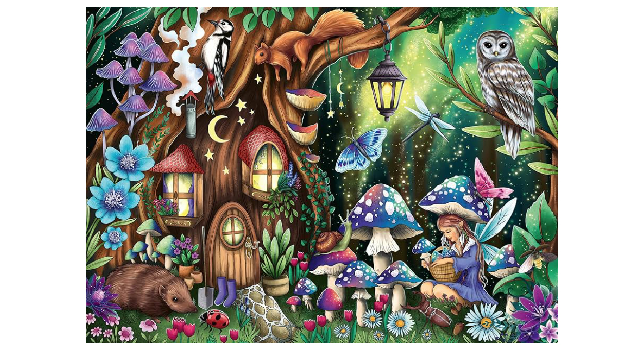 Imaginea puzzle-ului prezintă o pădure fermecată, populată cu creaturi magice, copaci impunători, vegetație luxuriantă și detalii fantastice care îmbină natura cu elementele mitice.