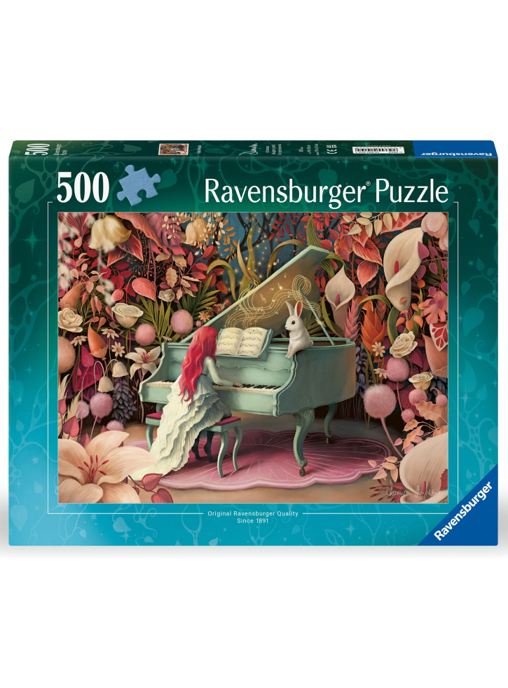 Ravensburger Puzzle Rabbit Recital 500p este un puzzle care prezintă o scenă fermecătoare în care un iepure alb stă pe un pian mare, înconjurat de flori vibrante, precum crini și trandafiri.