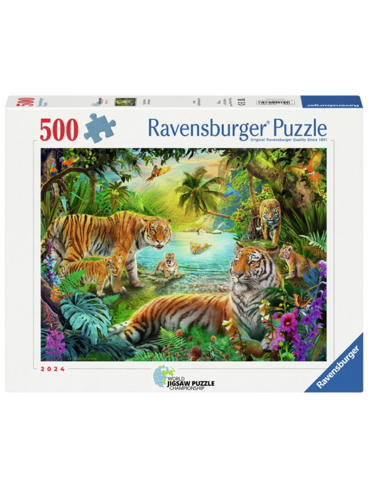 Pășește în sălbăticie cu acest captivant puzzle de 500 de piese care prezintă o familie maiestuoasă de tigri.