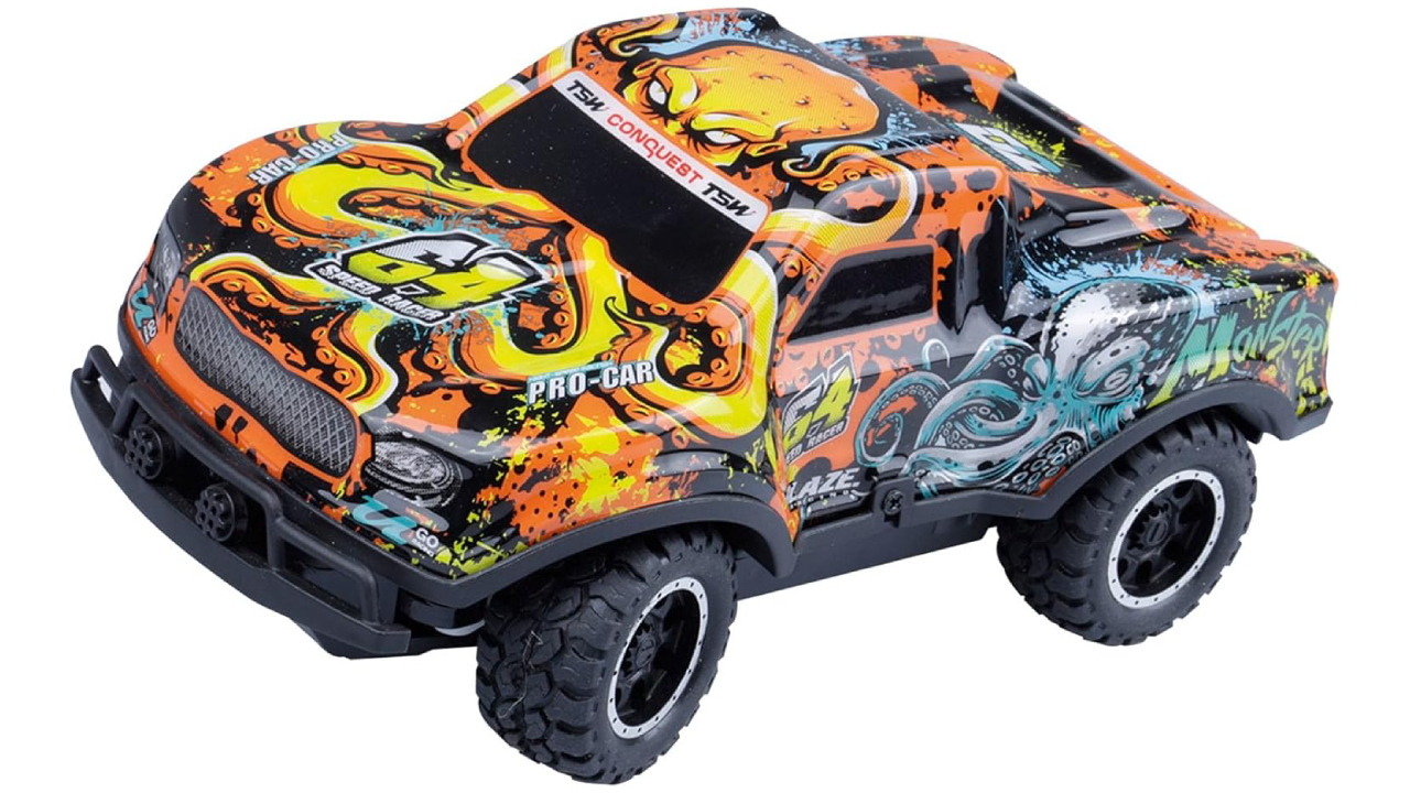 Telecomanda ușor de utilizat asigură că vehiculul este ușor de controlat, fie că se deplasează în viteză pe covor în interior sau pe trotuar afară.