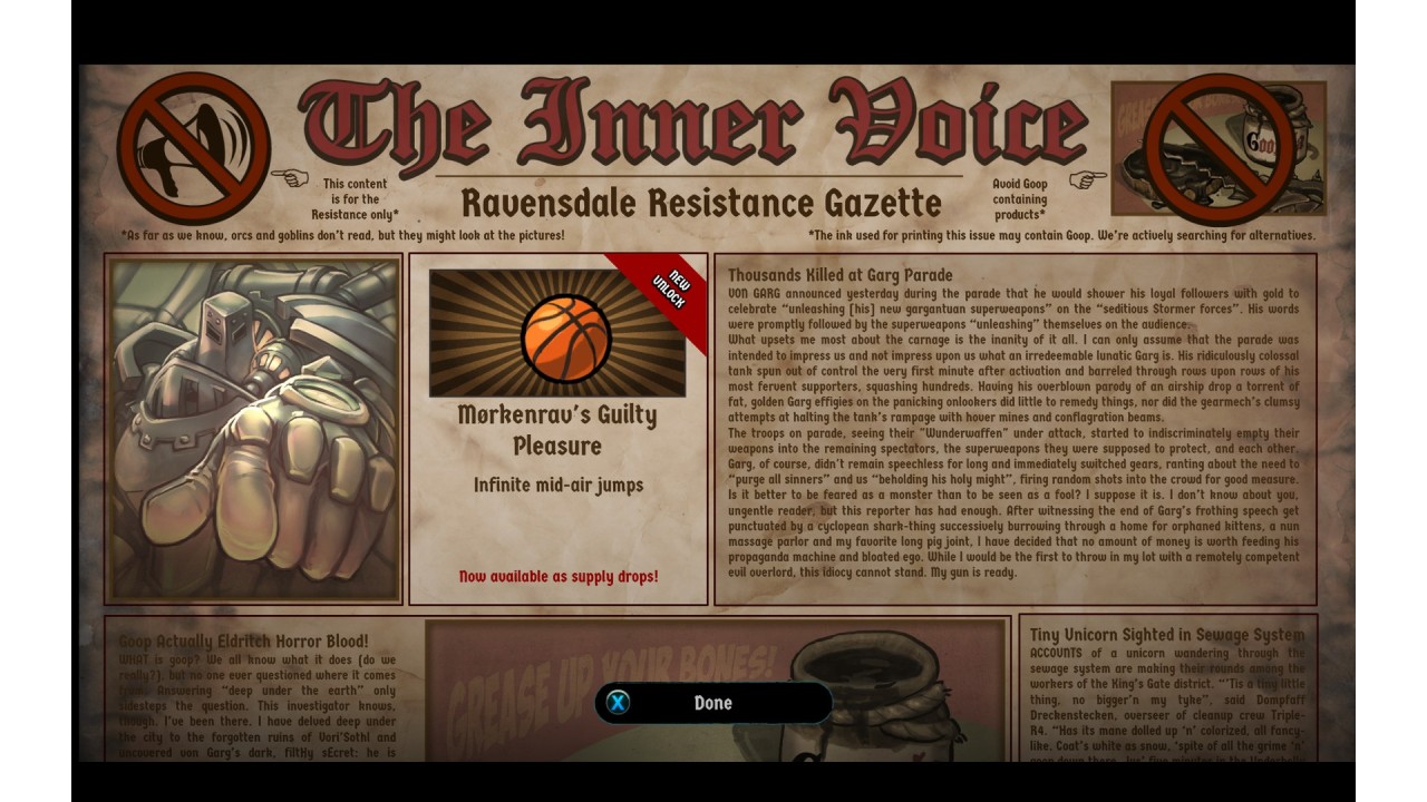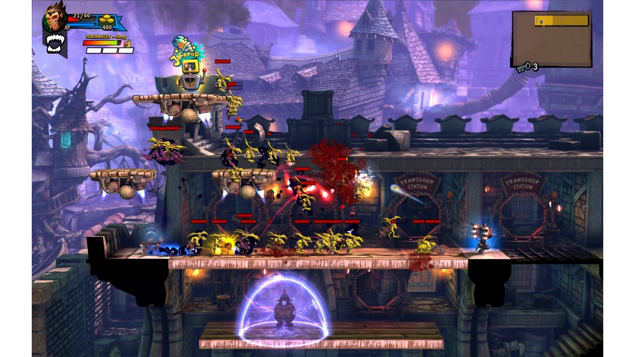 Delve deep into the oil rig city of Ravensdale. A medieval metropolis that went bonkers after the people discovered goop - a raw fluid that provided energy, skin cream, bread spread and powered diesel engines. And it turned the people of Ravensdale into raging, bloodthirsty monsters. Lucky for them they have you, leading a pack of lunatic knights on a killing spree to save the city.