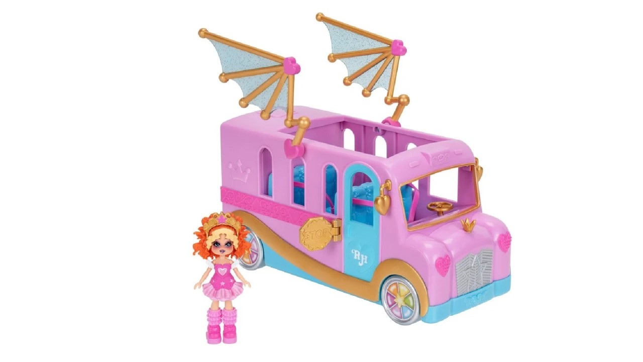 Setul include un autobuz de lux, decorat cu detalii strălucitoare și sofisticate, perfect pentru a transporta personajele în cele mai fabuloase locații.