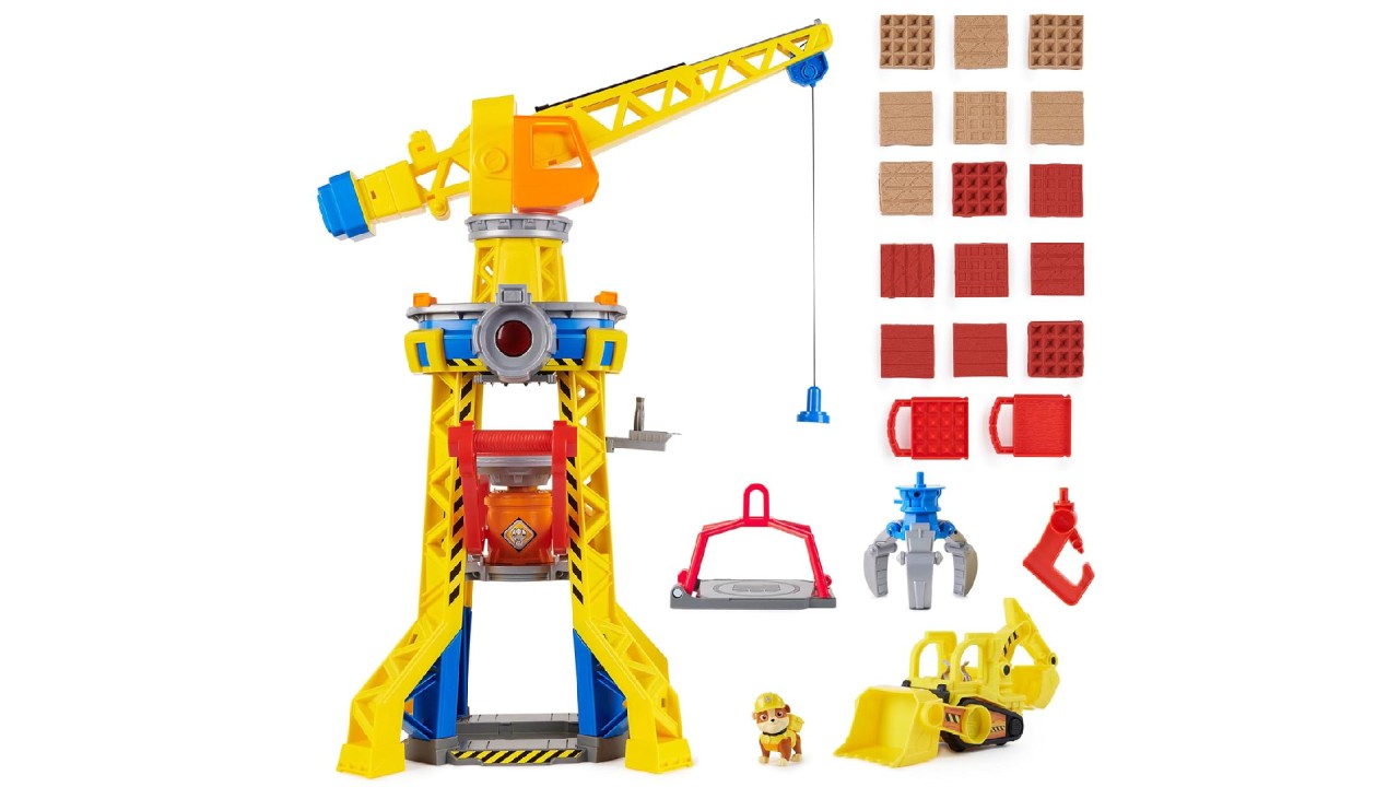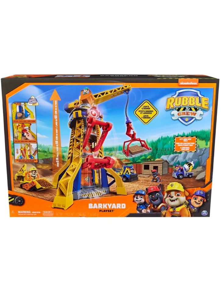 Pregătește-te să „Bow-Wow Build” cu cățelul tău preferat PAW Patrol, Rubble și un buldozer de jucărie cu unelte de construcție funcționale, în Rubble & Crew, Crane Tower Playset!