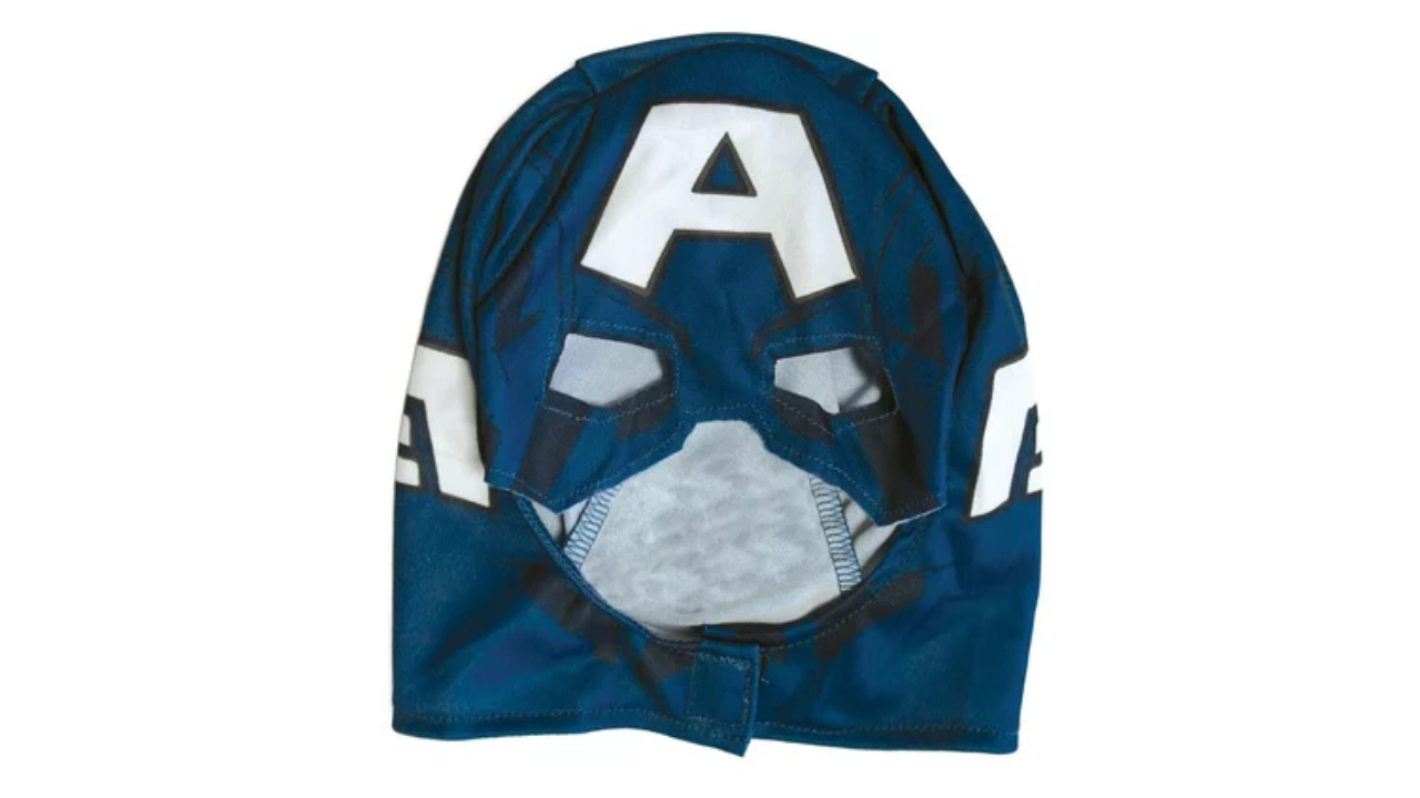 Foam hood in matching Captain America design with velcro closure under chin and eye area.