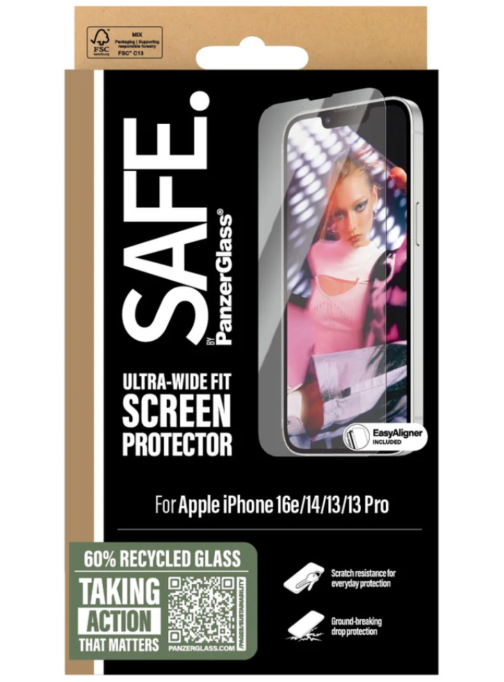 Această protecție pentru ecran SAFE. by PanzerGlass fabricată din 60% material reciclat acționează ca un airbag discret.