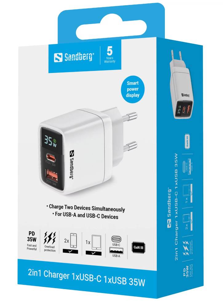 With the Sandberg 2 charger in 1 which includes 1 x USB-C and 1 x USB 35W you will have a small but powerful charger.