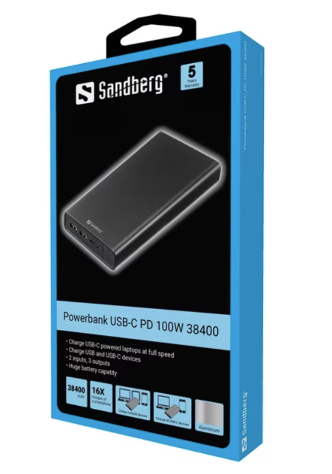 Powerbank-ul Sandberg 100 W PD 38 400 mAh este adaptat pentru utilizatorii care au nevoie de putere de încărcare serioasă - chiar și pe laptopuri.