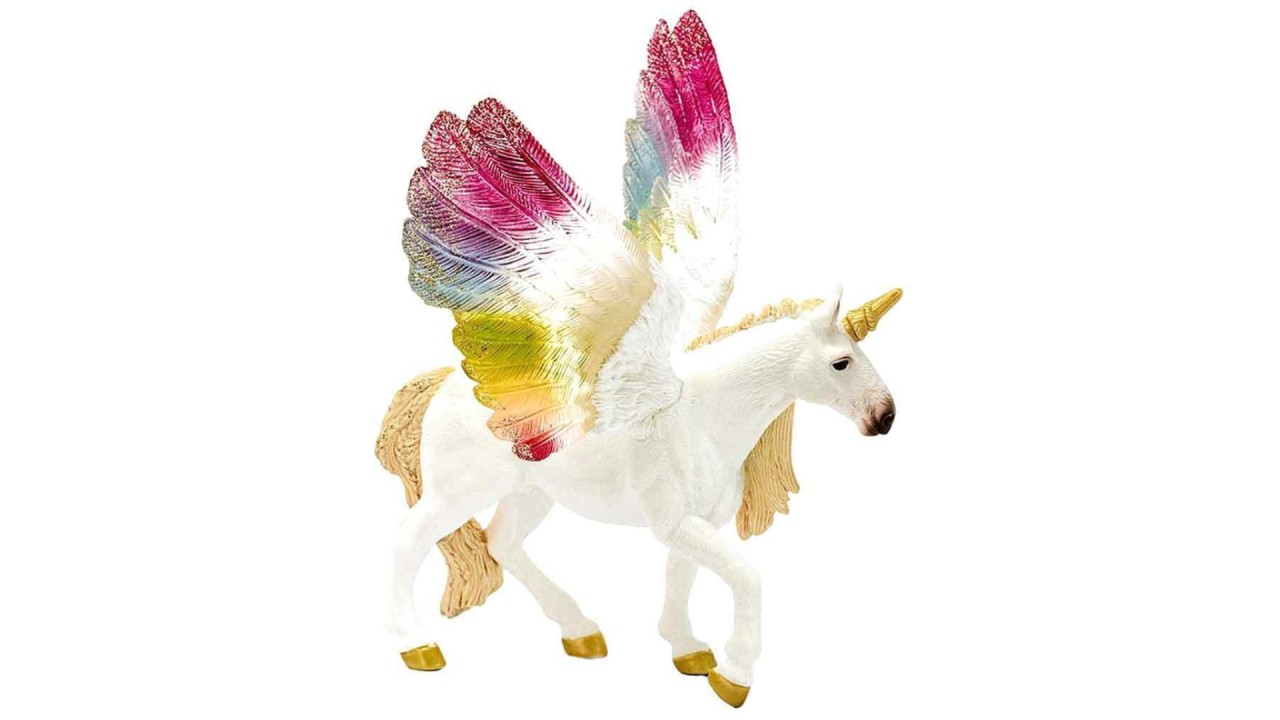 The unicorn has richly colored wings in splendid colors inspired by the beauty of the rainbow.