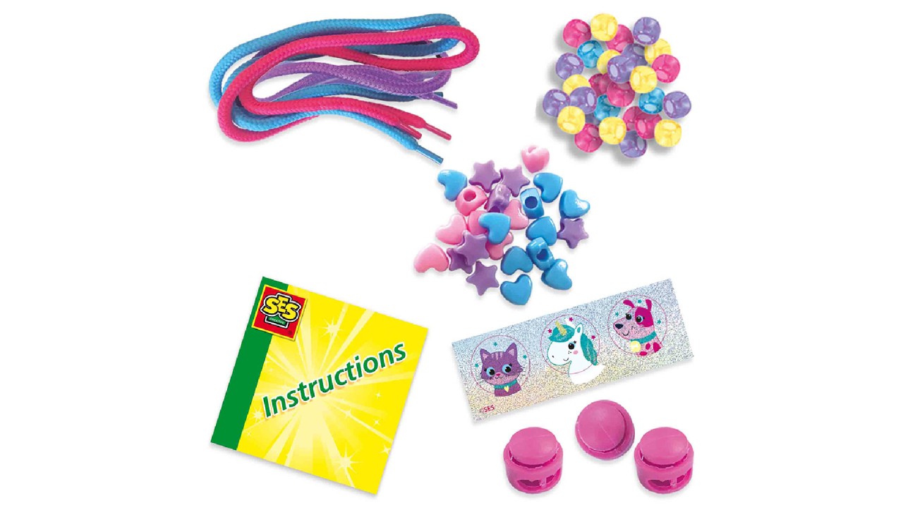 Setul contine: 3 șireturi colorate, 3 închizători reglabile, mărgele rotunde cu ponei în 4 culori diferite, mărgele cu stele, mărgele cu inimioare, autocolante cu sclipici.