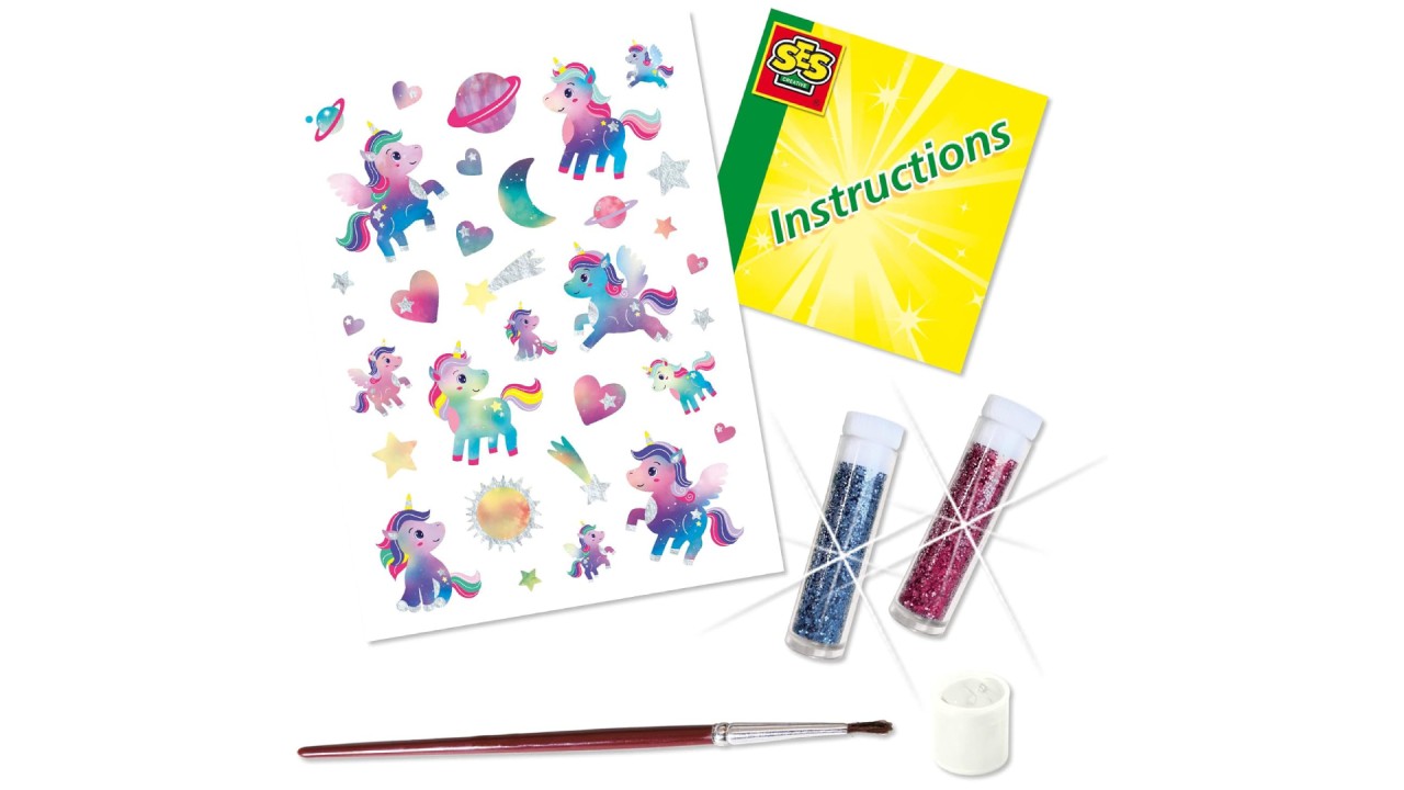 Acest set conține 32 de tatuaje metalice unicorn, lipici pentru piele, sclipici cosmetic în albastru și roz și o pensulă.