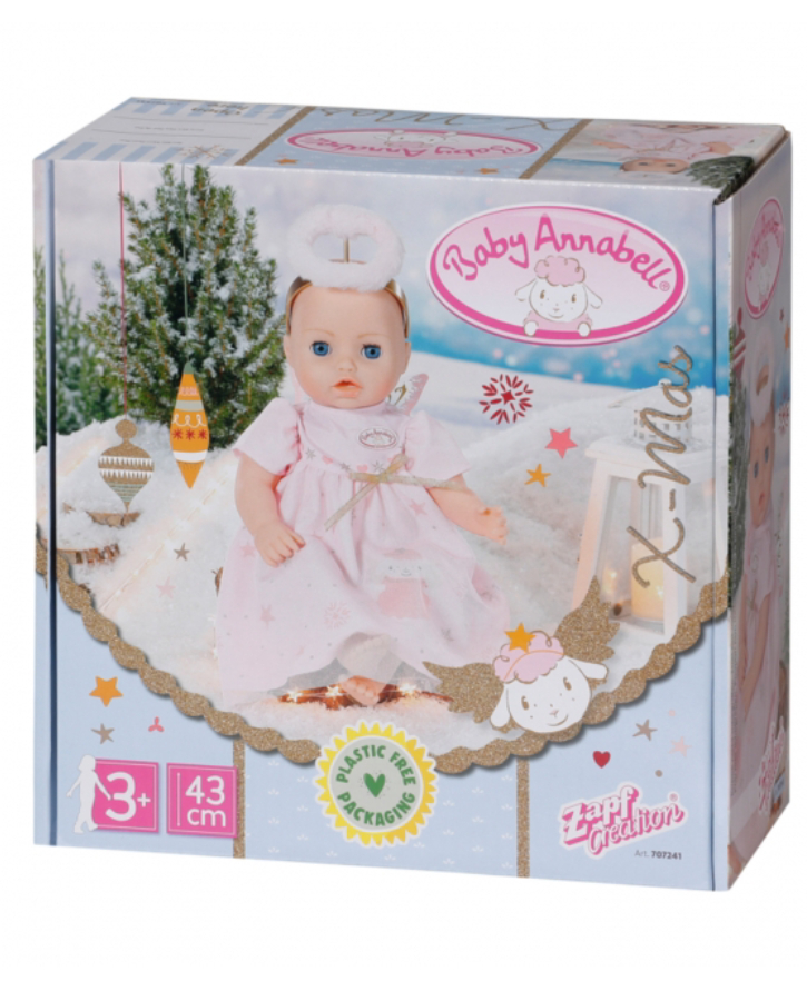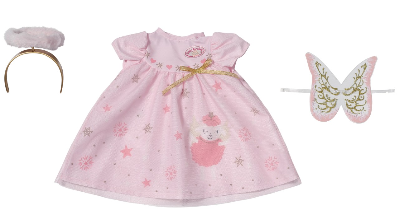 Baby Annabell este un îngeraș adorabil care poarta o rochie roz cu un strat delicat de tul, decorată cu imprimeuri de stele și fulgi de zăpadă.