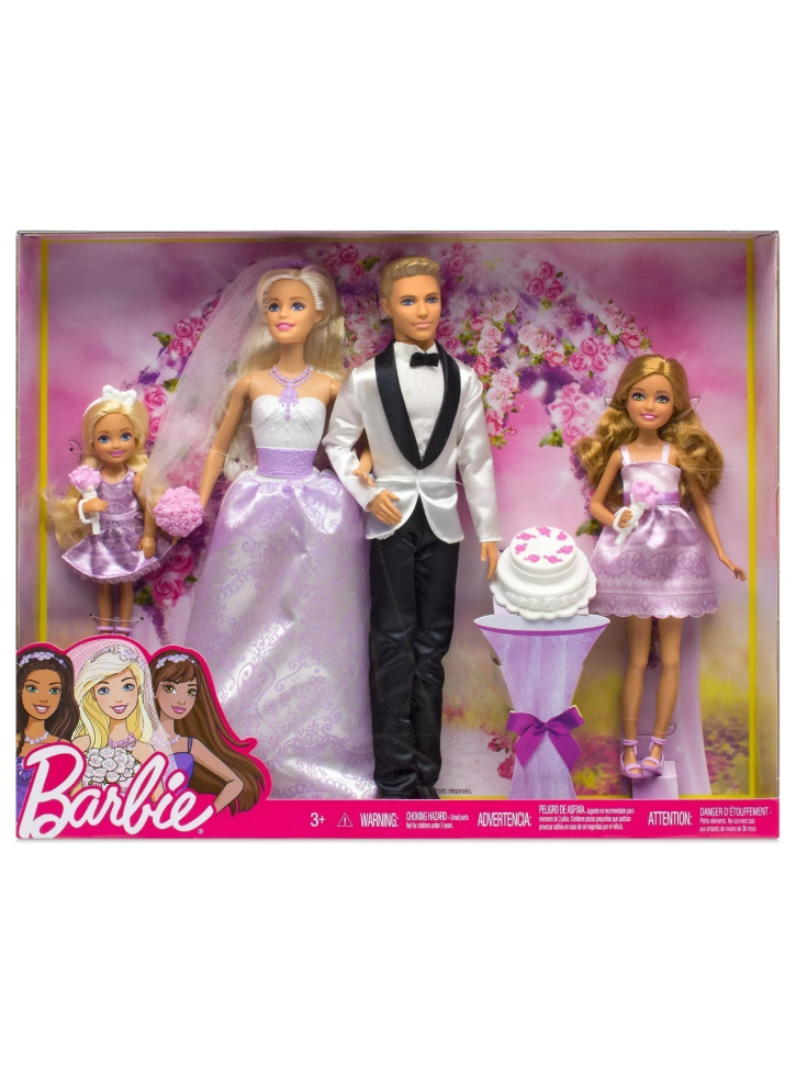 Acest frumos set cadou include o păpușă Barbie mireasă, o păpușă Ken mire, Stacie domnișoară de onoare și Chelsea domnișoară de onoare.