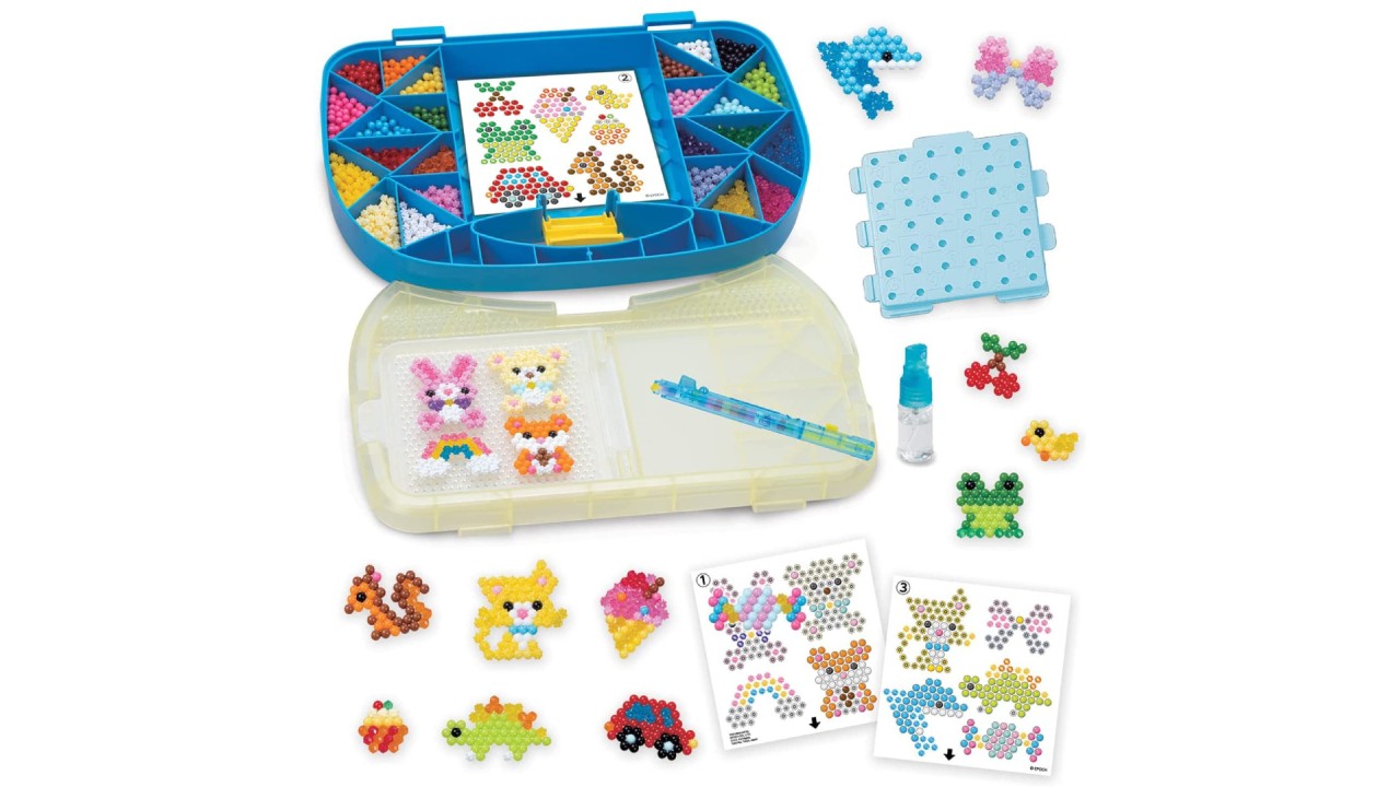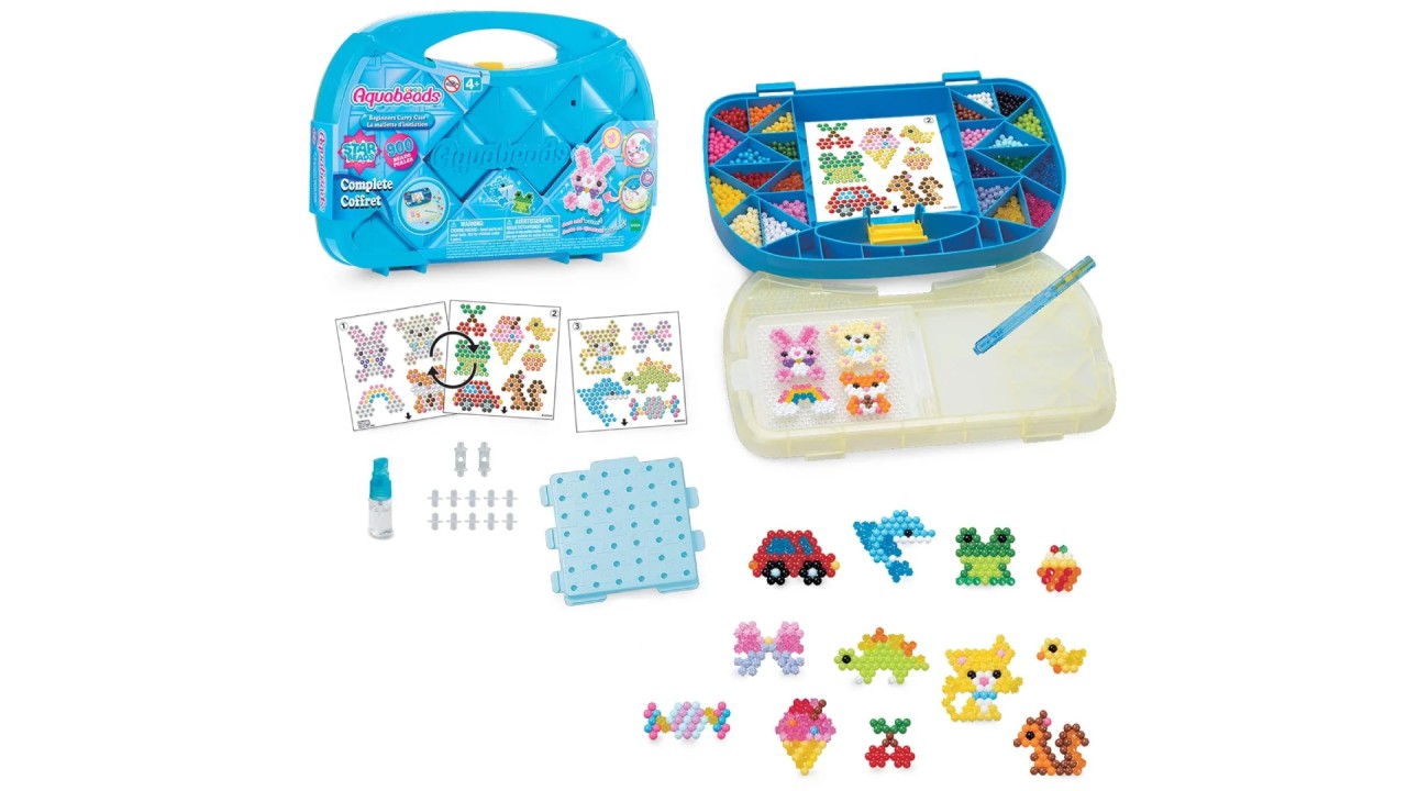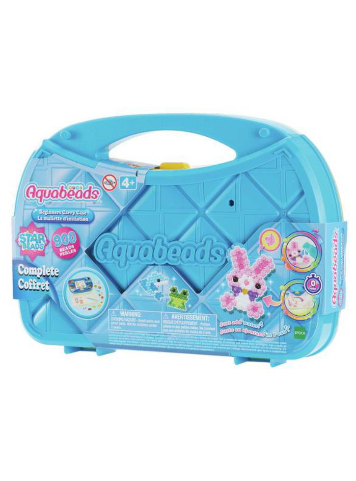 Acest set complet de mărgele pentru artă și artizanat include peste 900 de mărgele în 24 de culori, o trusă de transport cu tavă rabatabilă și paletă de mărgele, un stilou Aquabeads cu două fețe, un pulverizator, un afișaj pentru creație, cuie de design, foi de șablon și instrucțiuni.