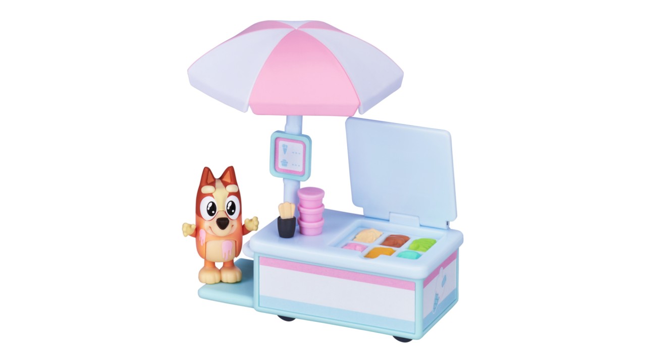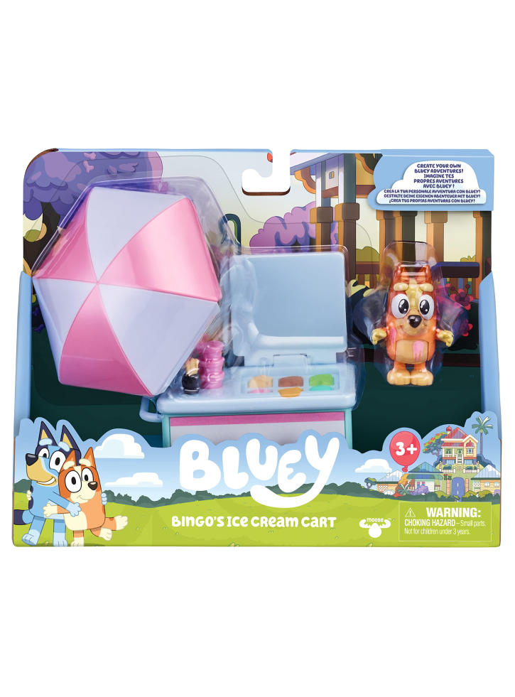 Aduceți acasă distracția și jocul imaginativ al lui Bluey cu Pachetul de vehicule și figurine cu cărucior de înghețată Bingo.