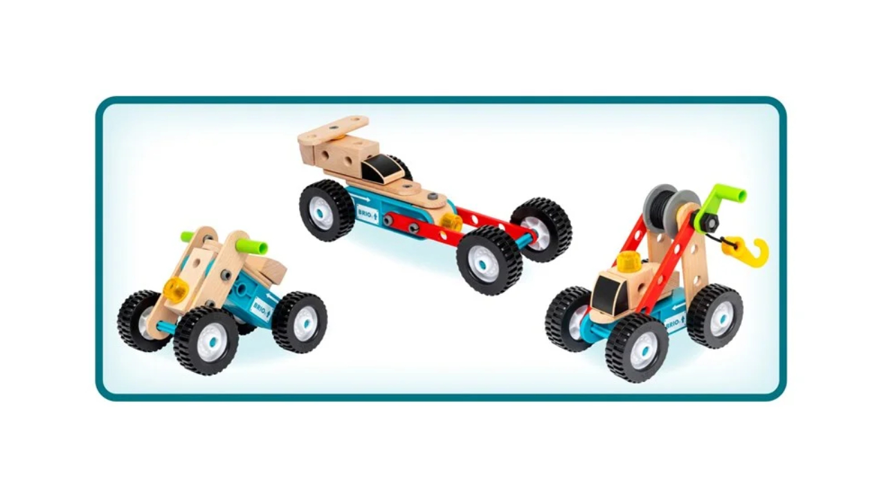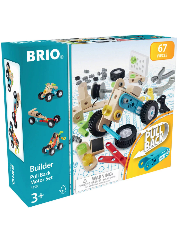 Combine the various wooden and plastic components with the pull-back motor to create new vehicles.
