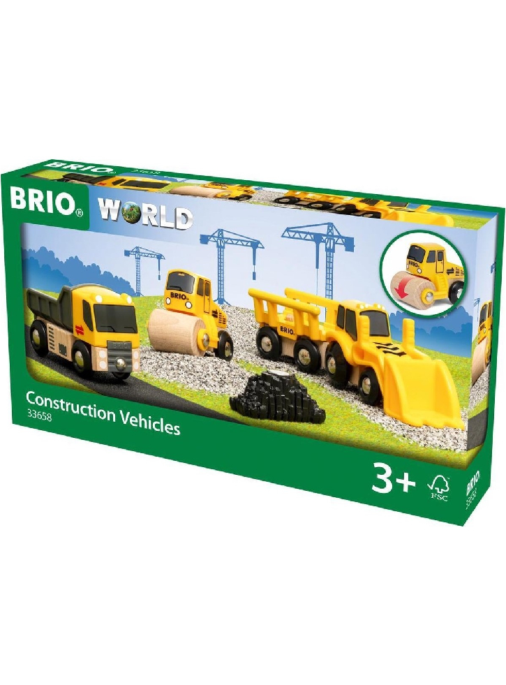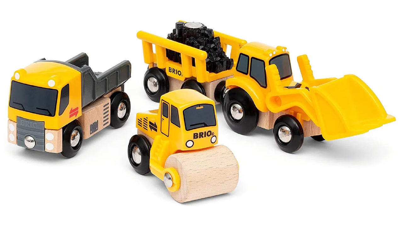 Acest set de vehicule din lumea BRIO include un camion basculant, un compresor cu aburi si un incarcator cu vagon basculant – toate avand detalii din lemn natural.